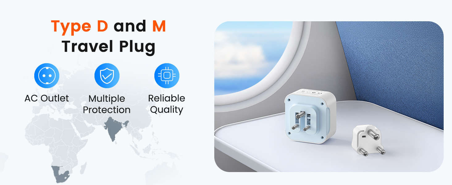 AI大模型翻译 Travel Adapter Type D and M: Foldable Type D travel plug adapter with Type M plug is suitable for countries with mixed socket systems. Suitable Countries: Namibia, South Africa, India, Nepal, etc. Additional country lists can be found in the description. Broad Compatibility: To meet a wider range of charging requirements, the LENCENT Type-D adapter features 2 USB-C ports (max. 15W per port at 5V/3A) and 2 USB-A ports (max. 12W per port at 5V/2.4A). The Type-D plug delivers a maximum power of 10A, 2500W at 250V, while the Type-M plug provides 10A, 4000W at 250V. It is compatible with nearly all smartphones, power banks, vaporizers, razors, and cameras. Portable compact size: The LENCENT travel adapter Type D (7.5*7.2*5.2cm) and Type M (5.3*3.1*3.1cm) are compact and lightweight, fitting perfectly in any bag. Whether you're traveling or working abroad, this adapter is your ideal companion and requires minimal space. Please note that this combined travel adapter is not a voltage converter! It is only suitable for devices with a voltage of 100 V to 250 V.