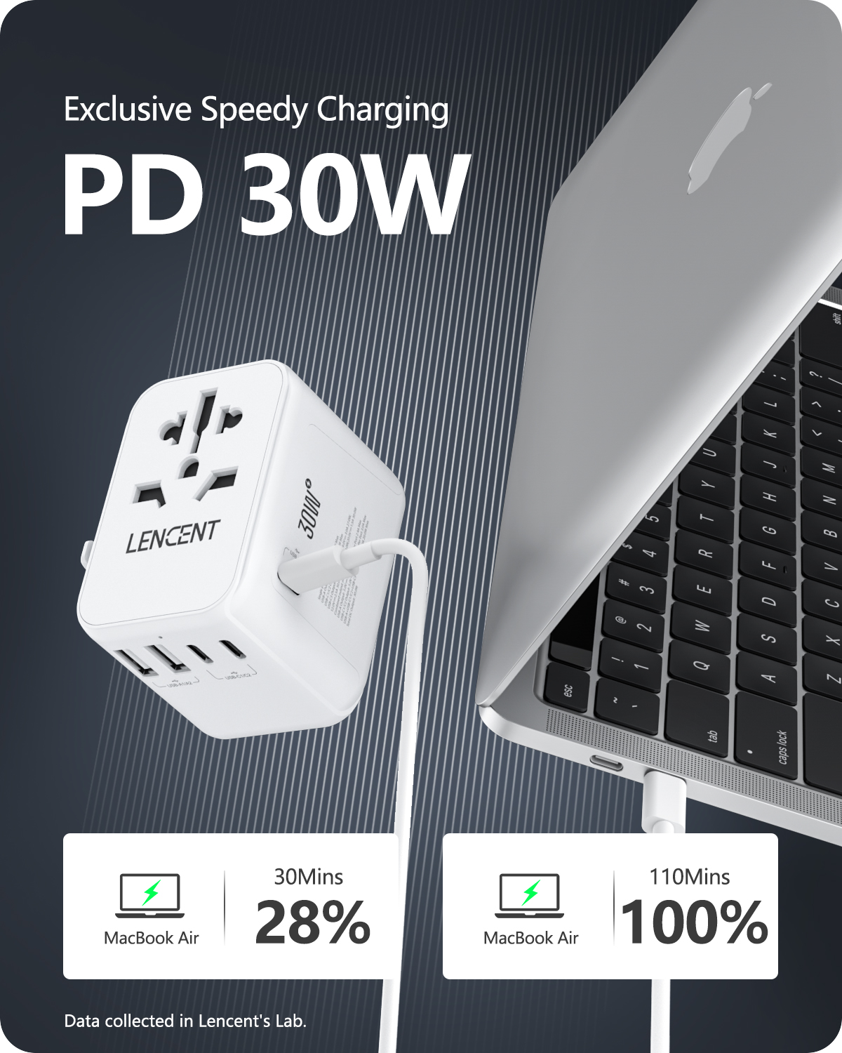 【30W PD Fast Charging】 With smart charging technology, it delivers an optimized charge to USB devices according to your device's needs. The single USB-C1 port (30W Max) can either power your MacBook Air M2 2022 with full speed, or used as a perfect charger block to provide full speed to the latest phones. 【Cutting-edge GaN III Technology】GaN Pro tech makes our latest charger smaller without a drop of power, and provides better low-temperature fast charging experience. Equipped with integrated double 10A fuse for overload protection and safety valve, it will protect people from injury if they directly touch live parts on the socket. 【AUTO-ID Technology for Intelligent Charging】 The LENCENT travel adapter with 2 USB ports & 3 Type C ports is capable of intelligently identifying connected devices and detecting and delivering optimum charging current, ensuring fast and safe charging. 【Universal Compatibility】This 30W charger support PD 3.0, QC4+ and PPS to provide flawless compatibility charging speeds for all USB powered devices like iPhone 14/14 Pro/14 Pro Max/14 Plus/iPhone 13/13 Pro/13 Pro Max, iPad Pro/iPad Air, MacBook Pro/Macbook Air, bluetooth earphone, e-reader, portable speakers and other device. 【Ideal for Travel】Portable(7.1*4.97*5.3cm) and lightweight(226g) USB adapter with interchangeable UK / US / EU / AUS plugs and international voltage compatibility, easy to carry, allows you to charge multiple devices simultaneously anywhere when you want. Works in over 200 countries and is compatible with almost all USB devices.Having NO surge protection & NO cord makes it fully cruise ship approved.