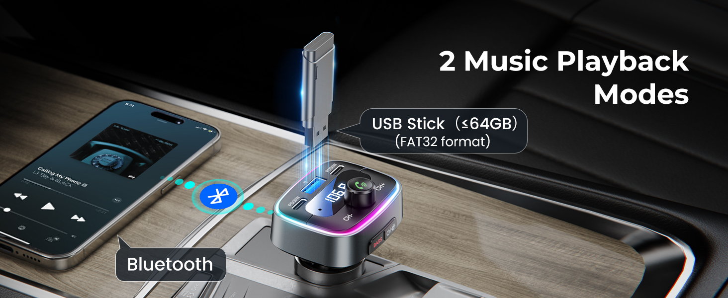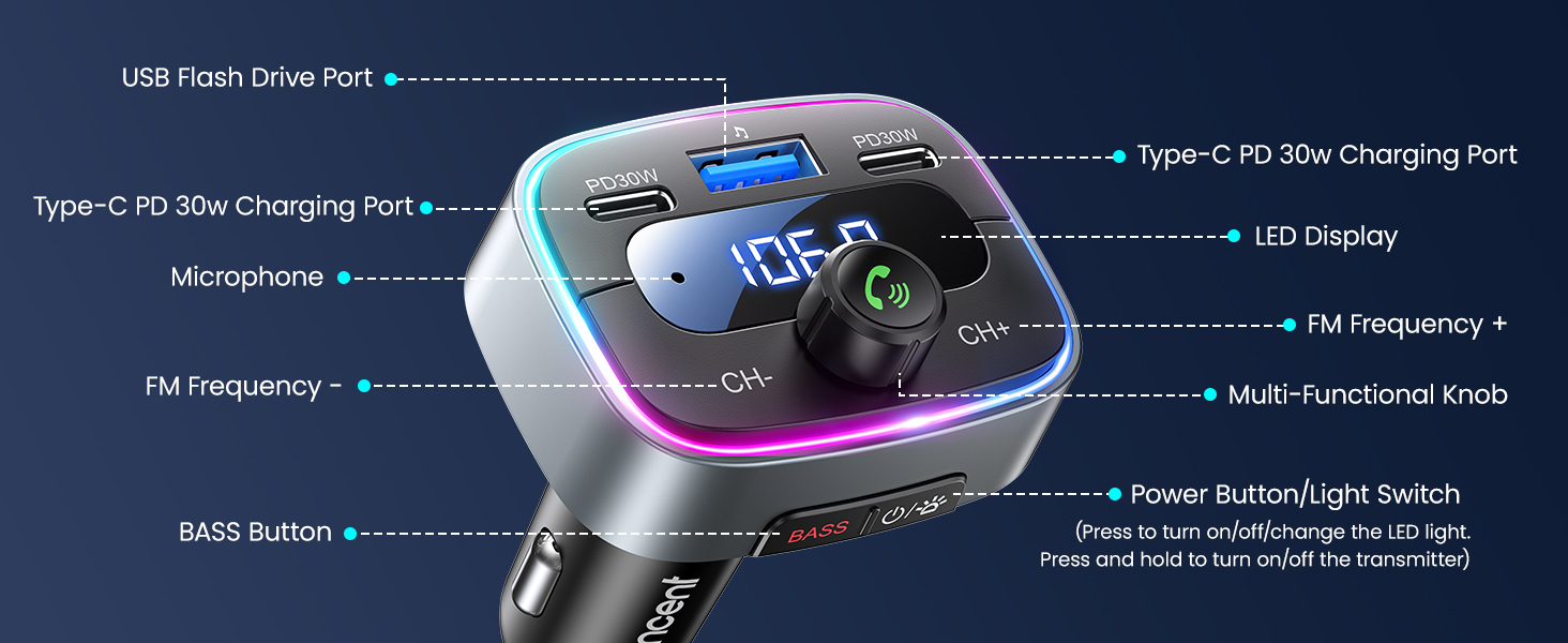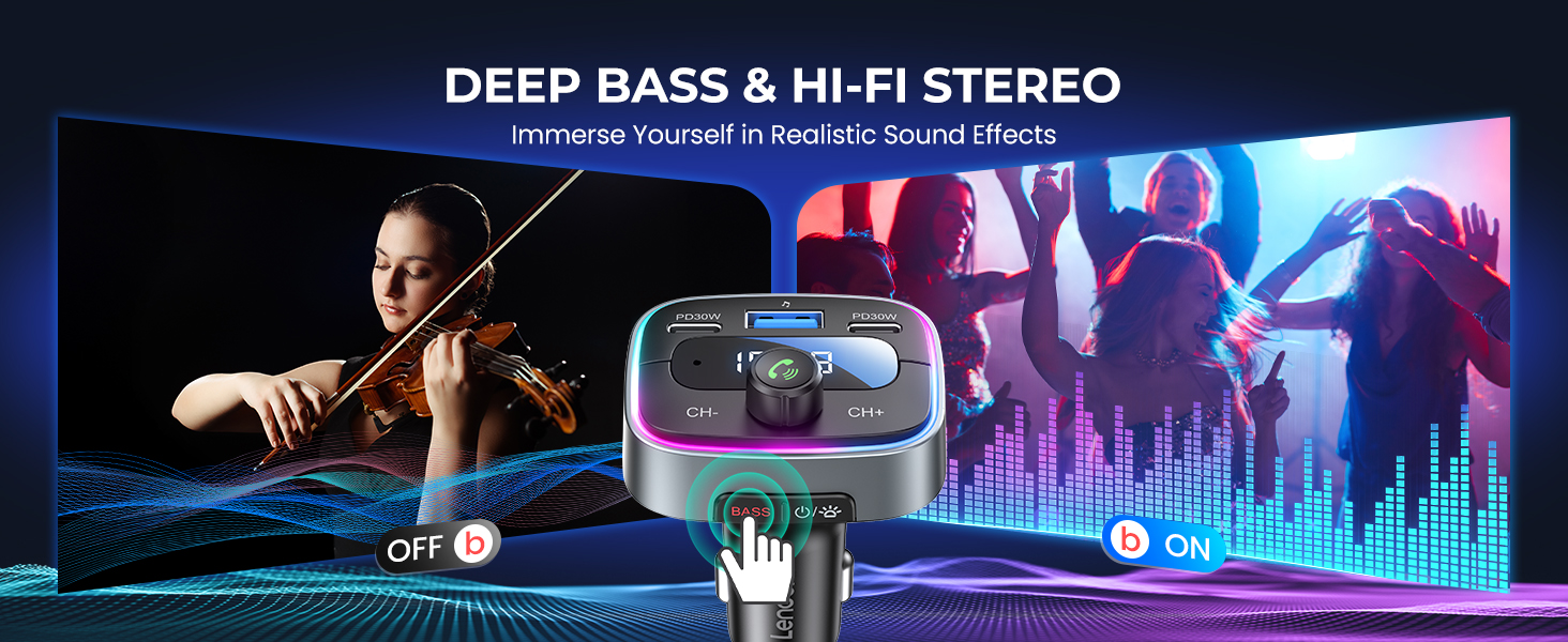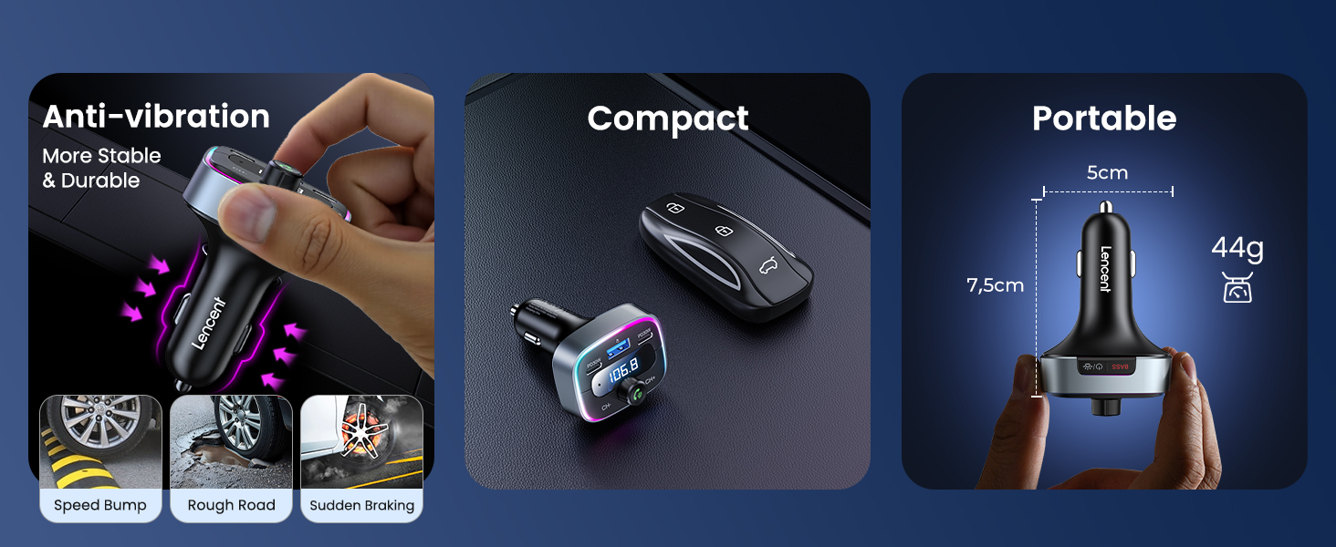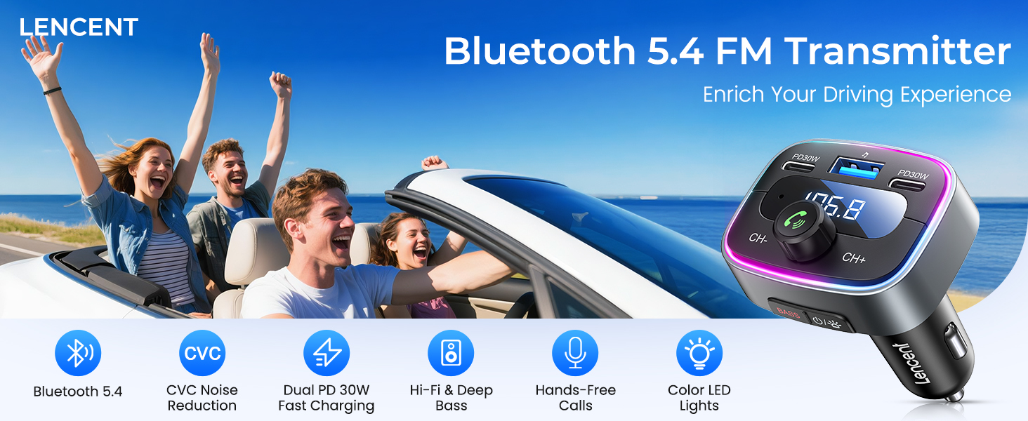 ImmersiveDeepBass&Hi-FiSound:Tiredofweak,tinnycaraudio?Simply pressthe‘B’button,LENCENTFMtransmitterbluetoothadapterdeliverspowerful, thumpingbassandcrystal-clearsoundthatmakeseverydrivefeellikeaconcert.Just plugin—andturnyourcarintoyourfavoritemusicspace. IntelligentDual30W|Total60WFastCharging:LENCENTbluetoothadapter autofeaturestwofastchargingUSB-Cportsthateachdeliver30Wofhigh-speedcharging— totaling60Wmaxoutput.Simultaneouslypoweryourphone,tablet,andothergadgetsatfull speed.Getupto70%batteryinjust30minuteswhileyoudrive!Thankstothein-builtover- current,over-voltage,overcharging,overload,overheating,andshort-circuitprotections,you canenjoyastraightforwardandsecureusingexperience. StableBluetooth5.4forMusic&Hans-freeCalls:Enjoyflawlessaudio streamingandcrystal-clearcallswithadvancedBluetooth5.4.Itprovidesafaster,more stable,andsmarterconnection,whilenoisereduction(CVC)technologyandecho cancellationallowanamazinghands-freecallingexperience,ensuringyourmusicand hands-freeconversationsremainuninterruptedontheroad.Experiencerichsoundand powerfulbasswithultra-lowlatency.Inaddition,thisBluetoothadaptersupportsBluetooth andUSBstickplayback(≤64GB). Enrichyourdrivingexperience:ThiscarBluetoothadapterfeaturessoft7-color monochromaticandcolorfulLEDlightmodes,helpingyouquicklylocatethedeviceand createanimmersivemusicatmosphereduringnwithitscompactdesign,thisFM transmitterforcarbluetoothfitsintomostcarcigarettelightersandsavesyouevenmore space.ightdrives.(Alllightscanbeturnedoff.).Thebuilt-involtageindicatorautomatically monitorsyourcar’spowerstatuswhenstartingforenhancedsafetyandreliability.With advancedvoicecommandsupport,enjoytrulyhands-freecontrolforasaferandmore comfortabledrive. Compact&WidelyCompatible:Withitscompactdesign,thisbluetoothFM transmittereasilyfitsintomostcarcigarettelightersandsavesvaluablespace.Its lightweightandportabledesignmakesiteasytotakewithyouwhereveryoudrive.The FMtransmitterautoworkssmoothlywithallkindsofBluetoothdevices—including iPhones,Androidphones,andtablets—andiscompatiblewithmost12V-24Vvehicles, suchascars,trucks,SUVs,andpickups,andmore.
