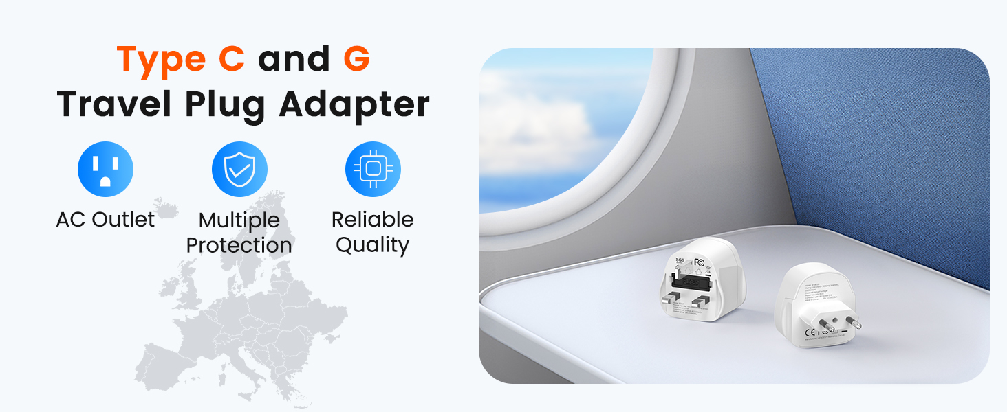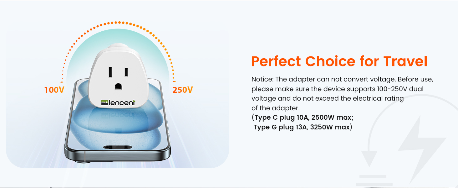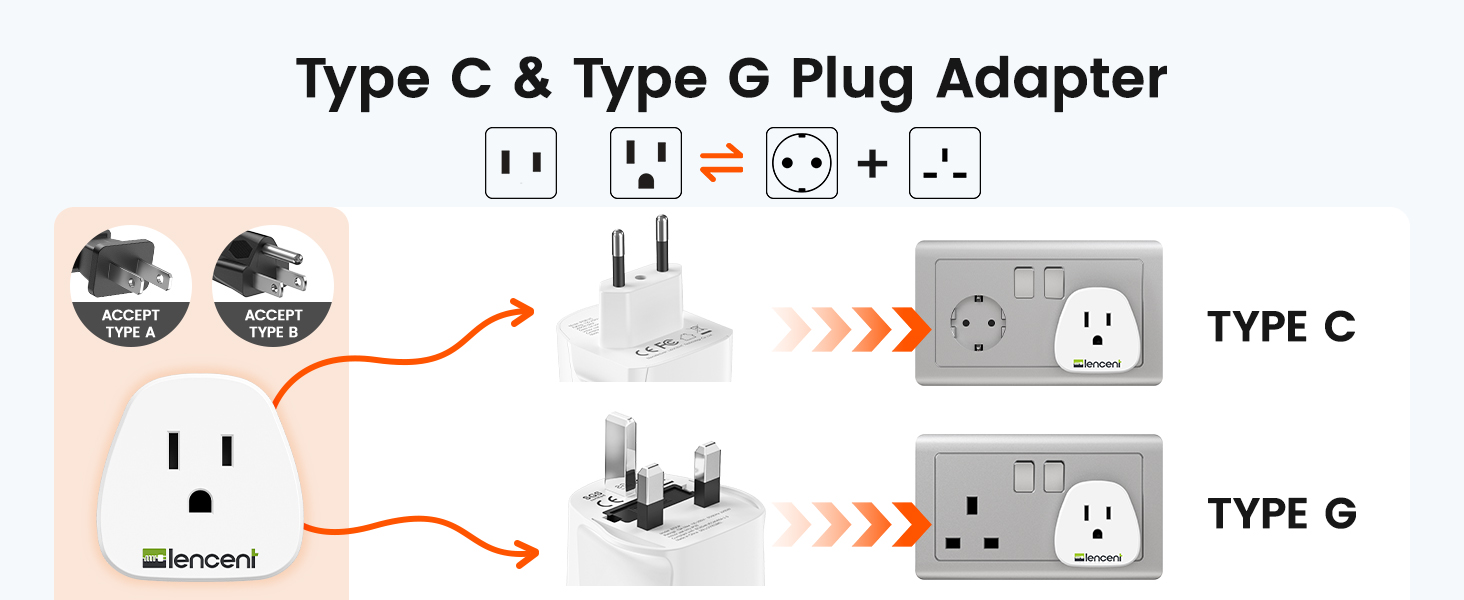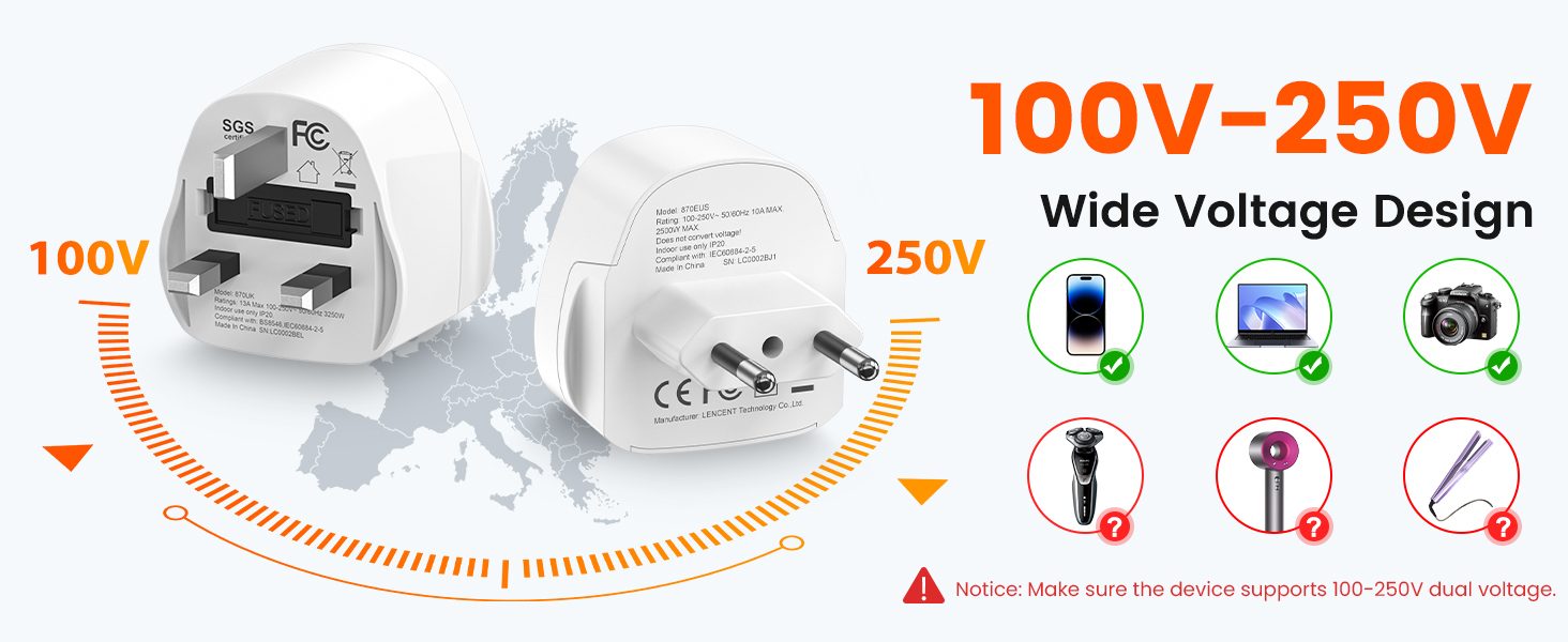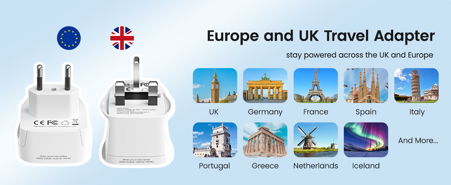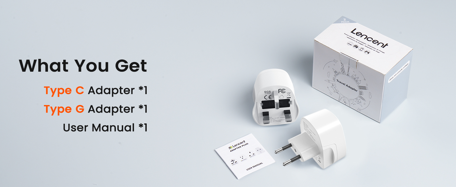 EU and UK travel Adapter Combo: A perfect all-in-one solution for journeys across the UK and Europe. Designed for convenience, it covers the two primary plug standards used in these regions, ensuring your devices stay powered wherever you are Suitable Countries: The UK, Ireland, Scotland, Germany, France, Spain, Italy, Portugal, Greece, Netherlands, Iceland Armenia, Belgium, Croatia, Denmark, Finland, Turkey, and more Portable Compact Size: This LENCENT type C and G travel plug adapter is compact and lightweight, easily slips into any bag. Wherever you're traveling, working overseas, this adaptor is an ideal companion for bringing along without taking up much space Wide Compatibility: This travel adapter kit is compatible with a wide range of travel essentials, including smartphones, power banks, iPhones, laptops, and cameras. The maximum output for the EU plug is 10A, 2500W at 250V; UK plug is 13A, 3250W at 250V Note: This is NOT A VOLTAGE CONVERTER. This adapter is only compatible for devices that support 100V-250V dual voltage, especially for hair dryer, straightener, electric toothbrush or razor, otherwise you may need a power voltage converter