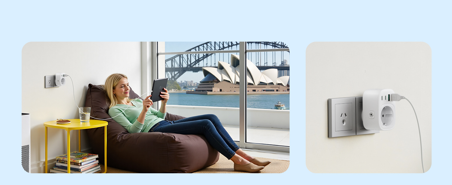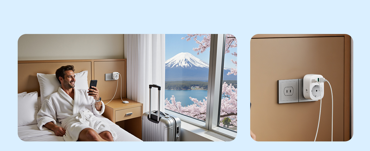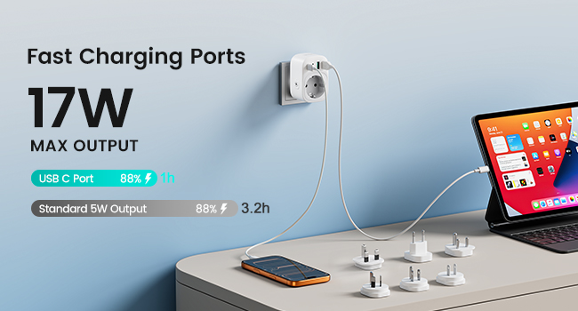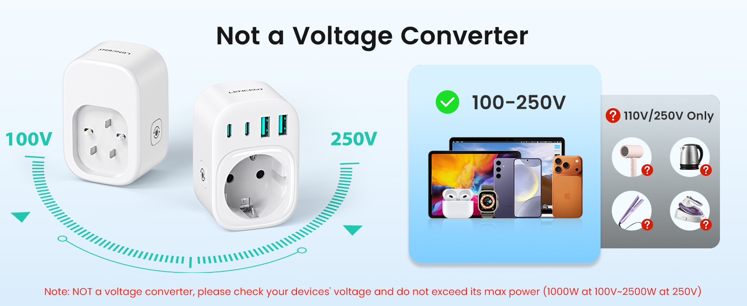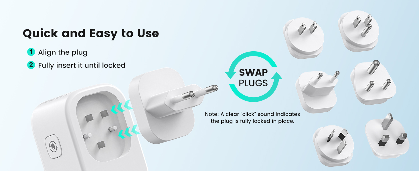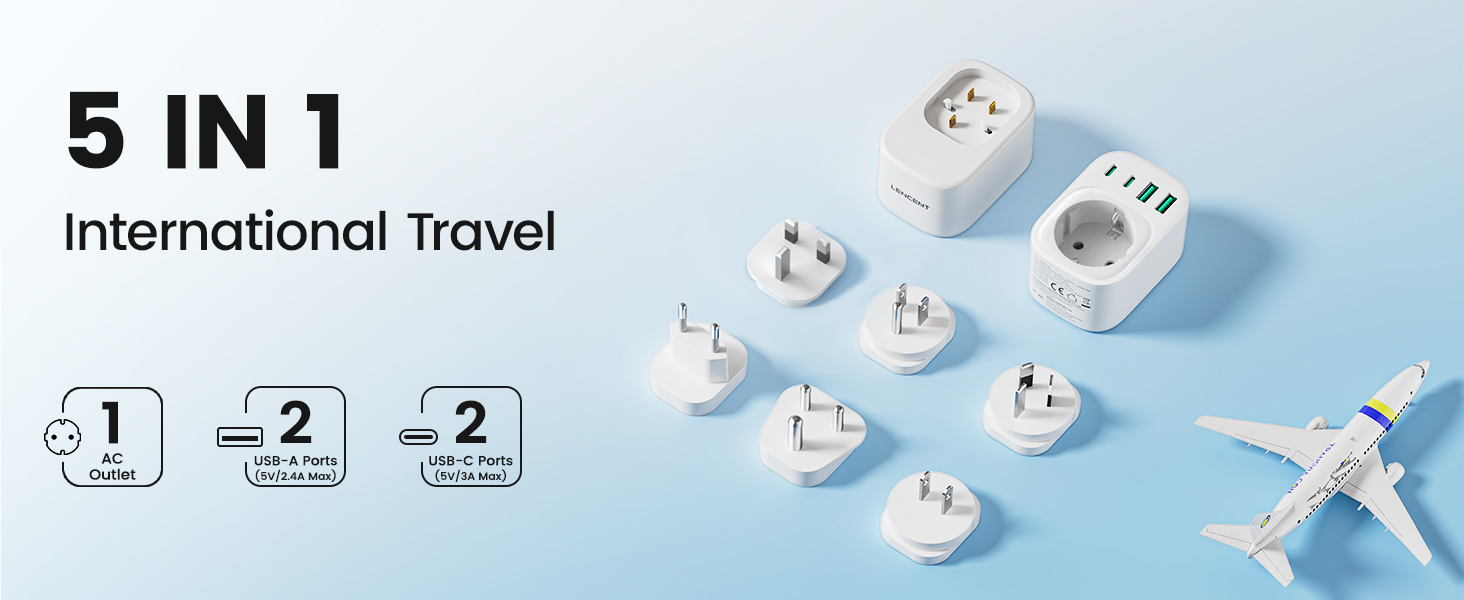 ---[International Travel Adapter] This worldwide travel adapter set includes 6 detachable plug attachments and can be used in over 180 countries, so you no longer need to worry about having the right plug. Type A: Mainly used in Japan, USA, Philippines, Mexico, China, Thailand, Anguilla, Colombia, and other countries. Type B: Mainly used in the USA, Canada, Mexico, Colombia, Thailand, American Samoa, and other countries. Type C: Mainly used in most European countries such as Germany, France, Spain, Italy, the Netherlands, Portugal, Greece, Poland, Turkey, and other countries. --- Type D: Mainly used in India, Nepal, Sri Lanka, Pakistan, and other countries. Type G: Mainly used in the UK, Dubai, Malta, Hong Kong, Ireland, Tanzania, Cyprus, Scotland, and other countries. Type I: Mainly used in Australia, China, Argentina, New Zealand, Fiji, the Cook Islands, Samoa, and other countries. Our universal adapter features six plug types, making it the ideal choice for frequent travelers. ---[USB Fast Charging] This universal travel adapter comes with 1 AC outlet, 2 USB-C ports, and 2 USB-A ports. Advanced technology enables charging speeds of up to 3.0 A / 15 W on USB-C ports and up to 2.4 A / 12 W on USB-A ports, providing power for fast charging of a wide range of USB-powered devices such as smartphones, tablets, laptops, cameras, and more. Ideal for frequent travelers and business travelers. ---[Easy to Use and Carry] A included storage bag accommodates all plug accessories, keeping them within easy reach at all times. You can switch the required plug types anytime, anywhere—operation is extremely simple. Our travel adapter is compact (7.8*5.25*4 cm) and lightweight (88.3 g), taking up very little space in your luggage. Its compact size allows it to fit easily into a backpack or briefcase. ---[NO Voltage Converter] This adapter does not convert voltage from 110V to 220V or vice versa. Please ensure that your hair dryer, hair straightener, CPAP machine, electric toothbrush, or shaver supports dual voltage (100V-240V) before use; otherwise, you may need a separate voltage converter. ---[Switching Plugs] Assembly:① Align the plug with the connector.② Fully insert the plug until a click is heard.Disassembly:③ Press and hold the "Release" button.④ Pull the plug out of the adapter.