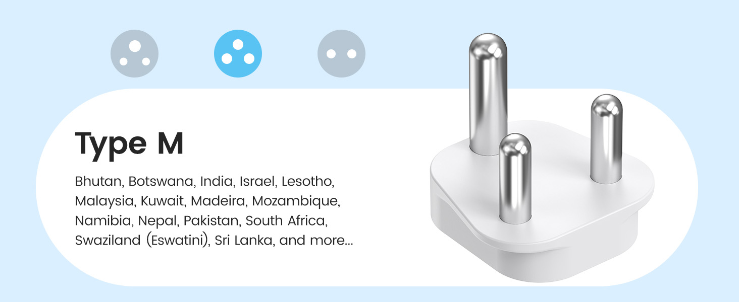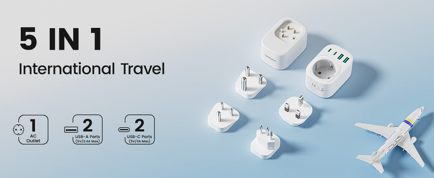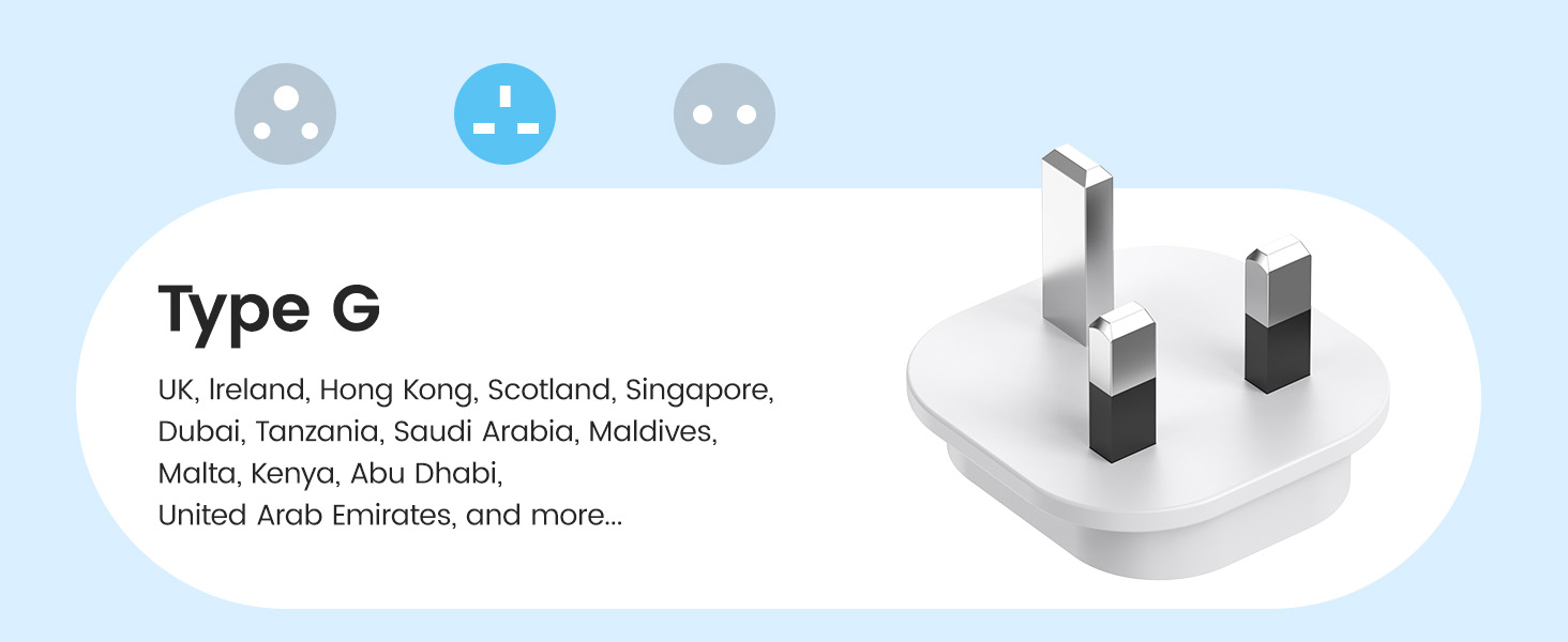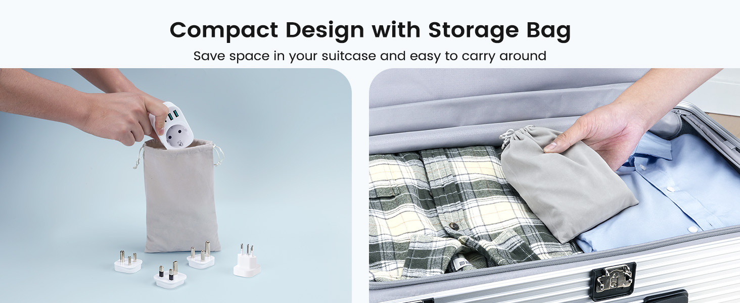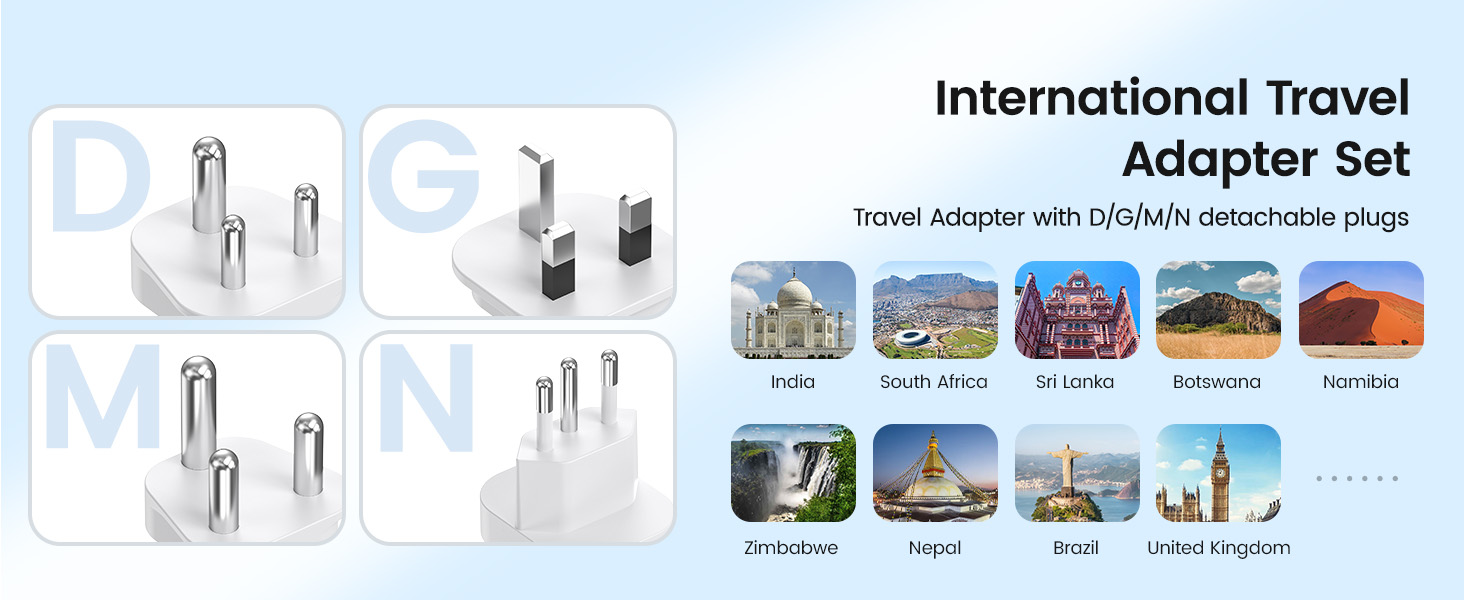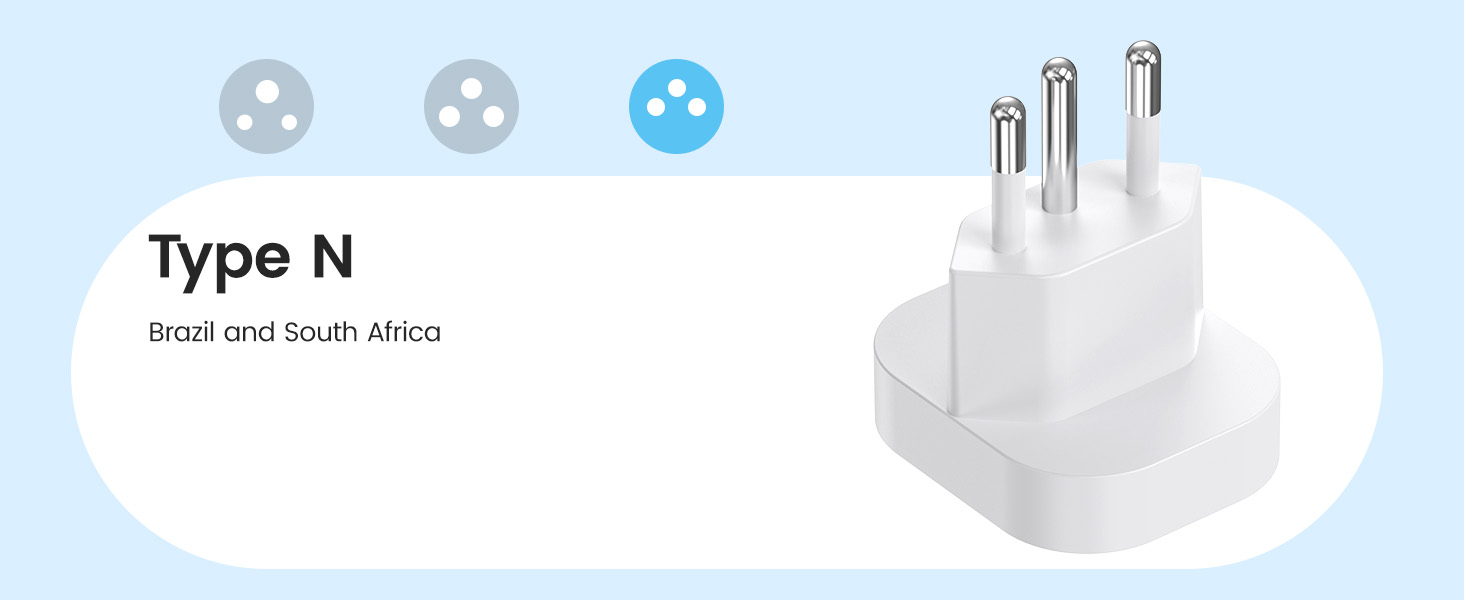 ---[International Travel Adapter] This worldwide travel adapter set includes 4 detachable plug adapters and can be used in over 150 countries. So you no longer have to worry about whether you have the right one. Plug Type D: Mainly used in India, Nepal, Sri Lanka, Pakistan, and other countries. Plug type G: Mainly used in the United Kingdom, Dubai, Malta, Hong Kong, Ireland, Tanzania, Cyprus, Scotland, and other countries. Plug type M: Mainly used in Bhutan, Botswana, India, Israel, Lesotho, Malaysia, Kuwait, Madeira, Mozambique, and other countries. Plug type N: Mainly used in Brazil and South Africa ---[USB Fast Charging] This universal travel adapter features 1 AC outlet, 2 USB-C ports, and 2 USB-A ports. Advanced technology enables charging speeds of up to 3.0 A/15 W on USB-C ports and up to 2.4 A/12 W on USB-A ports, providing power for fast charging of a wide range of USB-powered devices such as smartphones, tablets, laptops, cameras, and more. Ideal for frequent travelers and business travelers. ---[Easy to Use and Carry] An included pouch holds all adapter plugs, keeping them within easy reach at all times. You can switch between the plug types you need anytime, anywhere—it’s incredibly simple to use. Our travel adapter is compact (7.8 x 5.25 x 4 cm) and lightweight (88.3 g), so it takes up very little space in your luggage. Thanks to its compact size, it fits easily into a backpack or briefcase. ---[NOT a voltage converter] It does not convert voltage from 110 V to 220 V or vice versa. Please ensure that your hair dryer, hair straightener, CPAP machine, electric toothbrush, or electric razor is dual-voltage (100 V–240 V) if you wish to use them, as you may otherwise need a voltage converter. ---[Changing the Plug] Installation: ① Align the plug with the port. ② Insert the plug fully until you hear a click. Removal: ③ Hold down the “Switch” button. ④ Pull the plug out of the adapter.