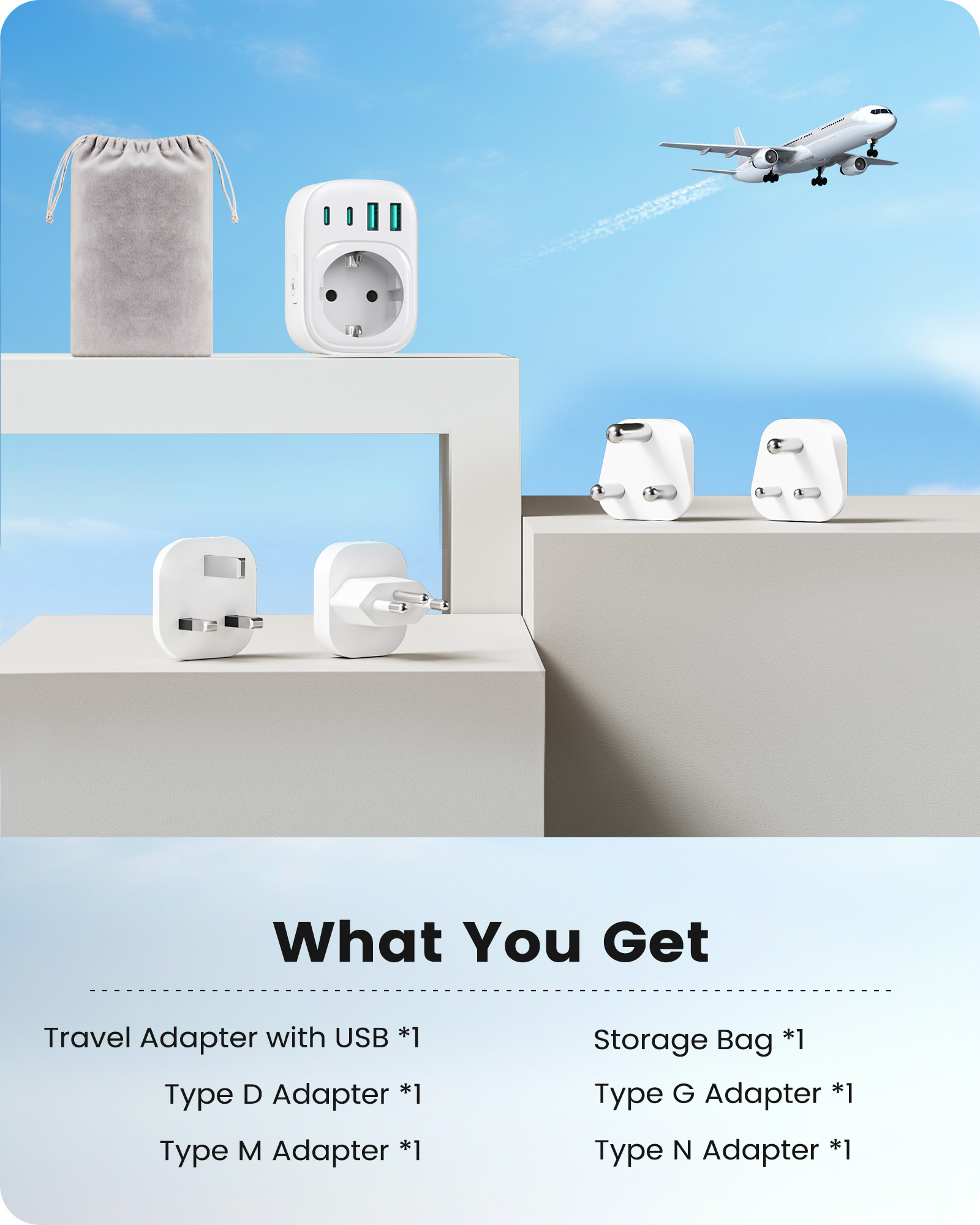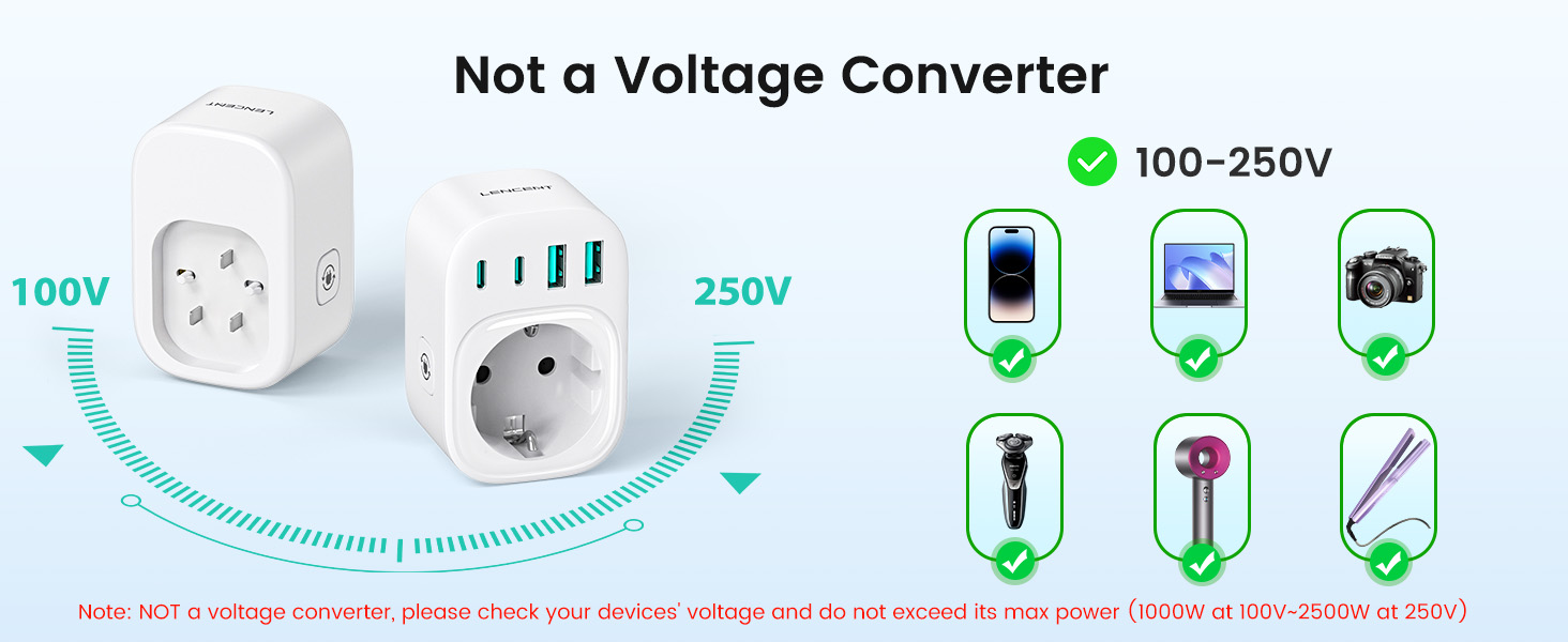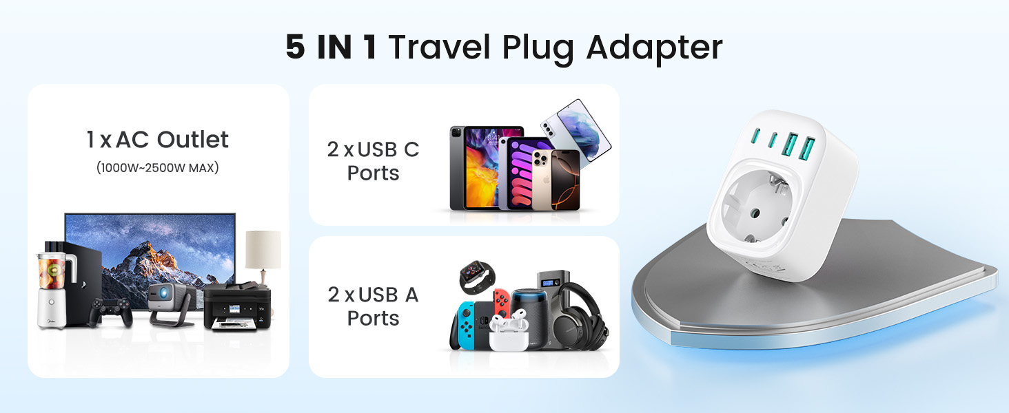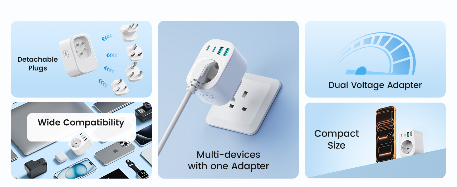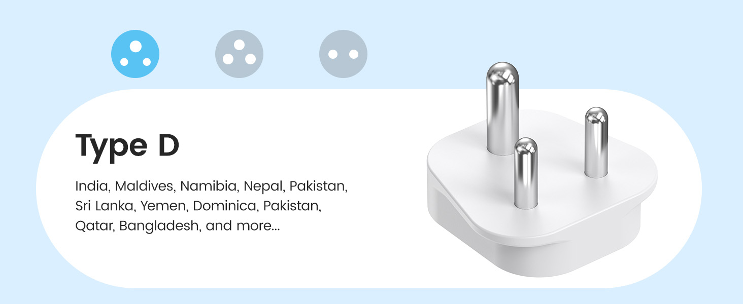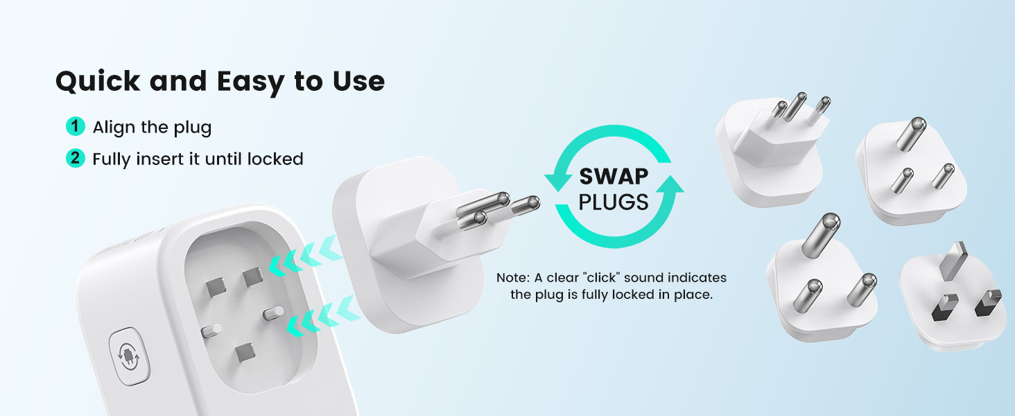 ---[International Travel Adapter] This worldwide travel adapter set includes 4 detachable plug adapters and can be used in over 150 countries. So you no longer have to worry about whether you have the right one. Plug Type D: Mainly used in India, Nepal, Sri Lanka, Pakistan, and other countries. Plug type G: Mainly used in the United Kingdom, Dubai, Malta, Hong Kong, Ireland, Tanzania, Cyprus, Scotland, and other countries. Plug type M: Mainly used in Bhutan, Botswana, India, Israel, Lesotho, Malaysia, Kuwait, Madeira, Mozambique, and other countries. Plug type N: Mainly used in Brazil and South Africa ---[USB Fast Charging] This universal travel adapter features 1 AC outlet, 2 USB-C ports, and 2 USB-A ports. Advanced technology enables charging speeds of up to 3.0 A/15 W on USB-C ports and up to 2.4 A/12 W on USB-A ports, providing power for fast charging of a wide range of USB-powered devices such as smartphones, tablets, laptops, cameras, and more. Ideal for frequent travelers and business travelers. ---[Easy to Use and Carry] An included pouch holds all adapter plugs, keeping them within easy reach at all times. You can switch between the plug types you need anytime, anywhere—it’s incredibly simple to use. Our travel adapter is compact (7.8 x 5.25 x 4 cm) and lightweight (88.3 g), so it takes up very little space in your luggage. Thanks to its compact size, it fits easily into a backpack or briefcase. ---[NOT a voltage converter] It does not convert voltage from 110 V to 220 V or vice versa. Please ensure that your hair dryer, hair straightener, CPAP machine, electric toothbrush, or electric razor is dual-voltage (100 V–240 V) if you wish to use them, as you may otherwise need a voltage converter. ---[Changing the Plug] Installation: ① Align the plug with the port. ② Insert the plug fully until you hear a click. Removal: ③ Hold down the “Switch” button. ④ Pull the plug out of the adapter.