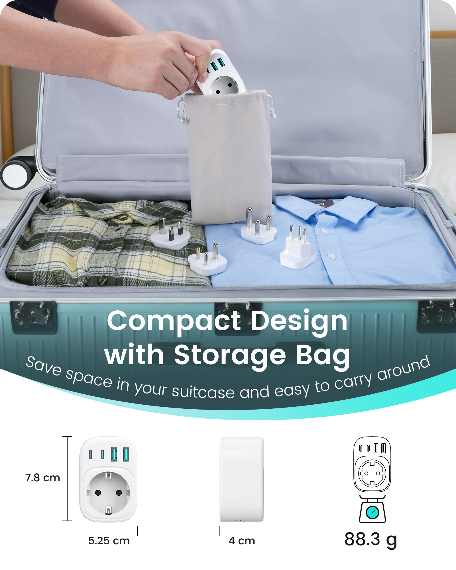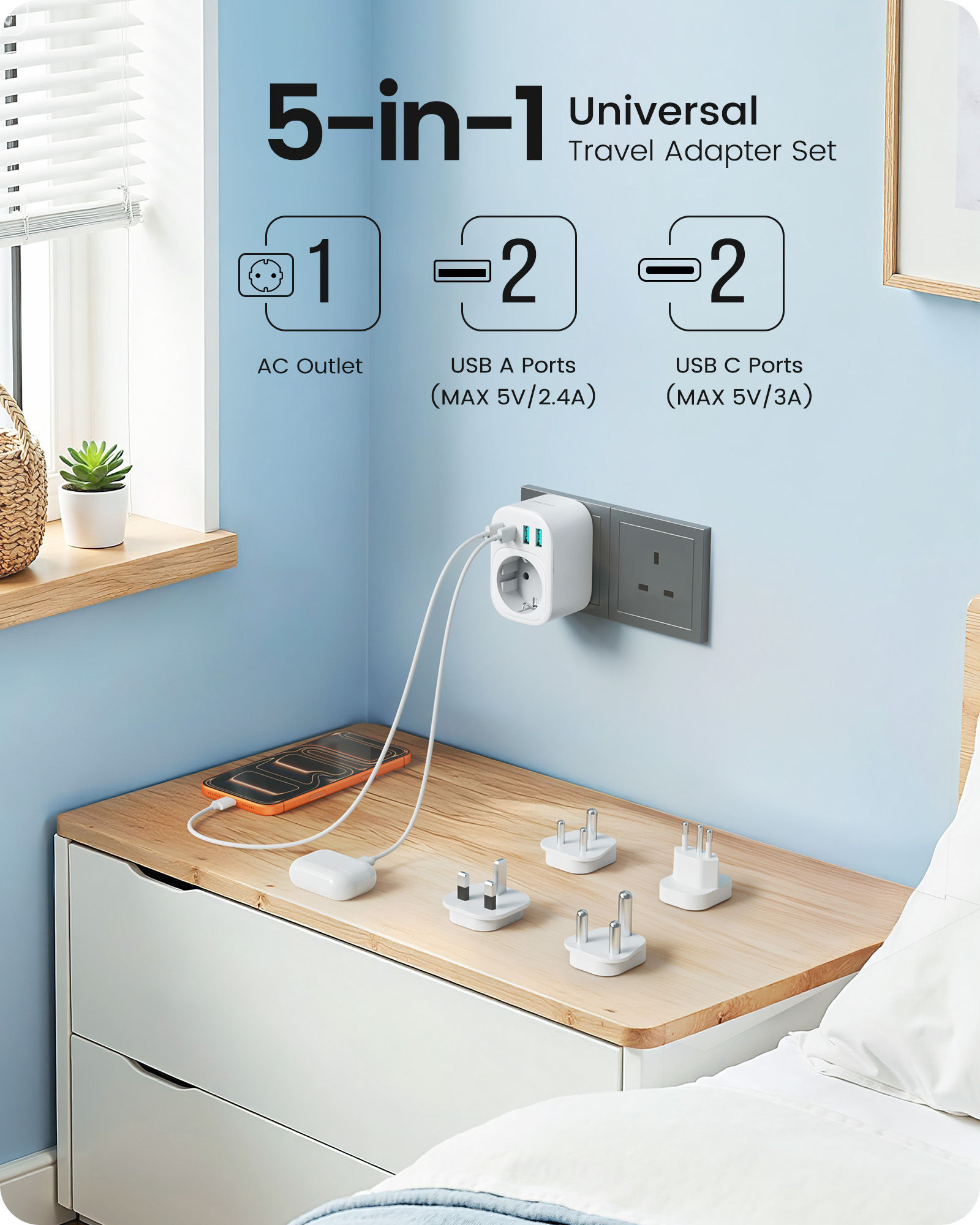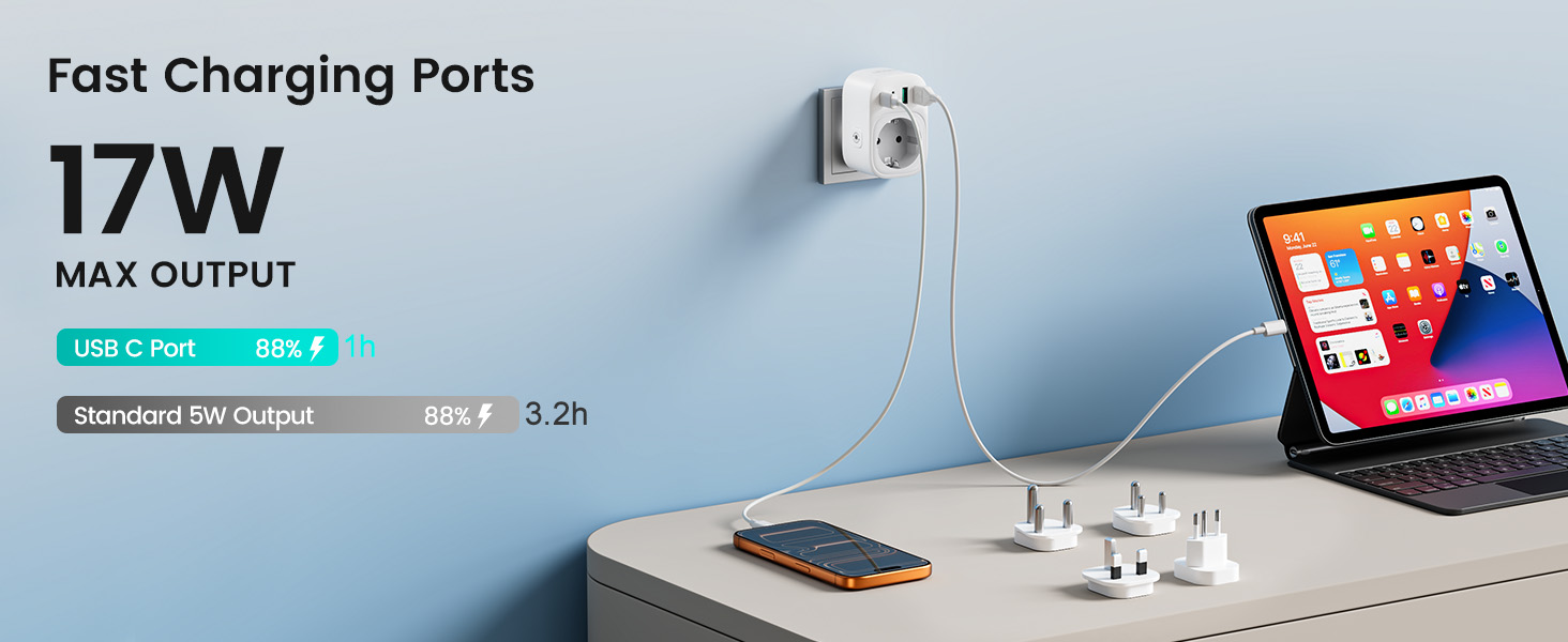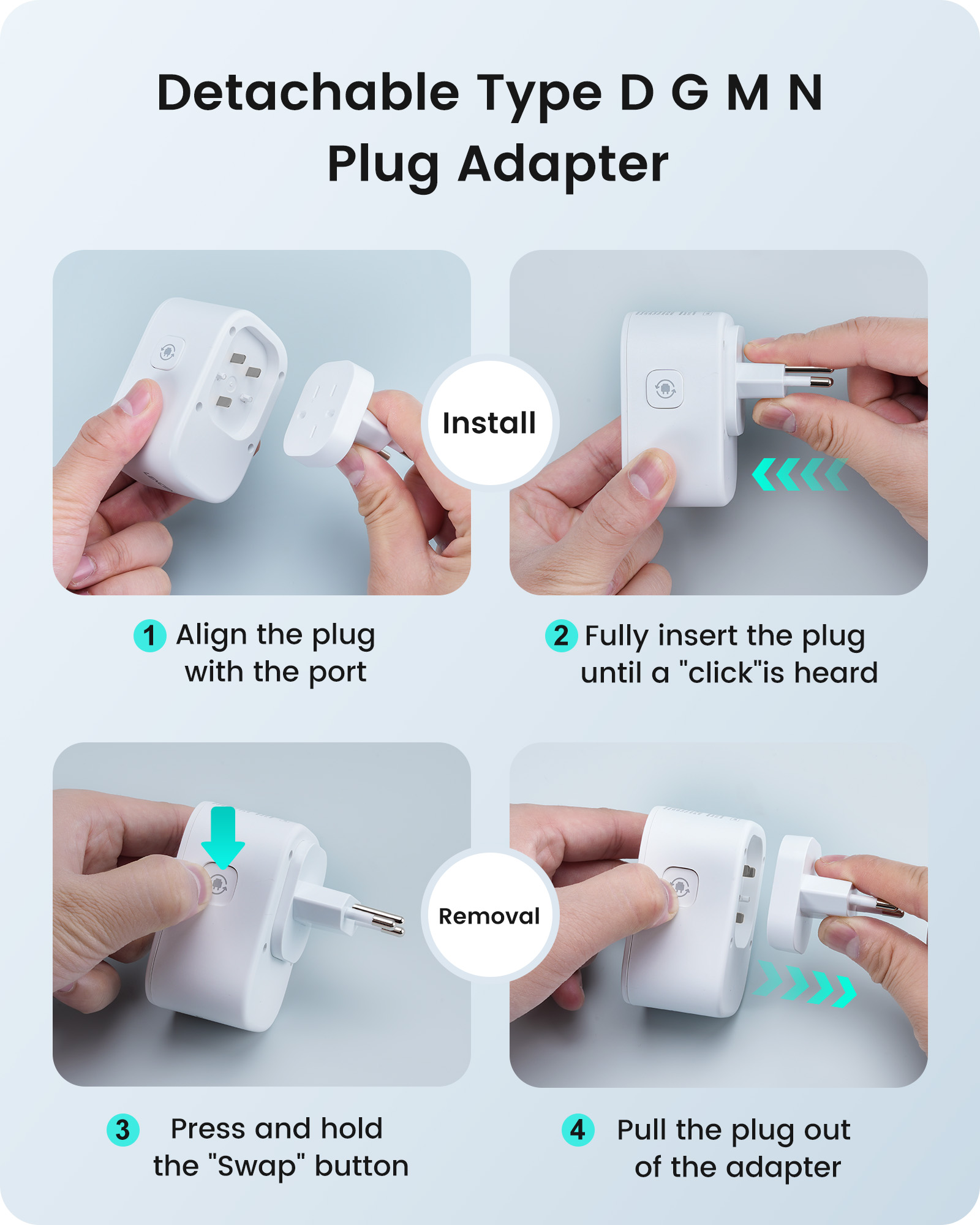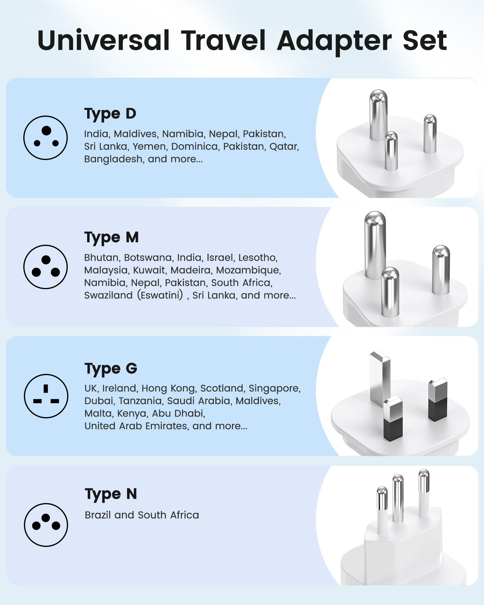 ---[International Travel Adapter] This worldwide travel adapter set includes 4 detachable plug adapters and can be used in over 150 countries. So you no longer have to worry about whether you have the right one. Plug Type D: Mainly used in India, Nepal, Sri Lanka, Pakistan, and other countries. Plug type G: Mainly used in the United Kingdom, Dubai, Malta, Hong Kong, Ireland, Tanzania, Cyprus, Scotland, and other countries. Plug type M: Mainly used in Bhutan, Botswana, India, Israel, Lesotho, Malaysia, Kuwait, Madeira, Mozambique, and other countries. Plug type N: Mainly used in Brazil and South Africa ---[USB Fast Charging] This universal travel adapter features 1 AC outlet, 2 USB-C ports, and 2 USB-A ports. Advanced technology enables charging speeds of up to 3.0 A/15 W on USB-C ports and up to 2.4 A/12 W on USB-A ports, providing power for fast charging of a wide range of USB-powered devices such as smartphones, tablets, laptops, cameras, and more. Ideal for frequent travelers and business travelers. ---[Easy to Use and Carry] An included pouch holds all adapter plugs, keeping them within easy reach at all times. You can switch between the plug types you need anytime, anywhere—it’s incredibly simple to use. Our travel adapter is compact (7.8 x 5.25 x 4 cm) and lightweight (88.3 g), so it takes up very little space in your luggage. Thanks to its compact size, it fits easily into a backpack or briefcase. ---[NOT a voltage converter] It does not convert voltage from 110 V to 220 V or vice versa. Please ensure that your hair dryer, hair straightener, CPAP machine, electric toothbrush, or electric razor is dual-voltage (100 V–240 V) if you wish to use them, as you may otherwise need a voltage converter. ---[Changing the Plug] Installation: ① Align the plug with the port. ② Insert the plug fully until you hear a click. Removal: ③ Hold down the “Switch” button. ④ Pull the plug out of the adapter.
