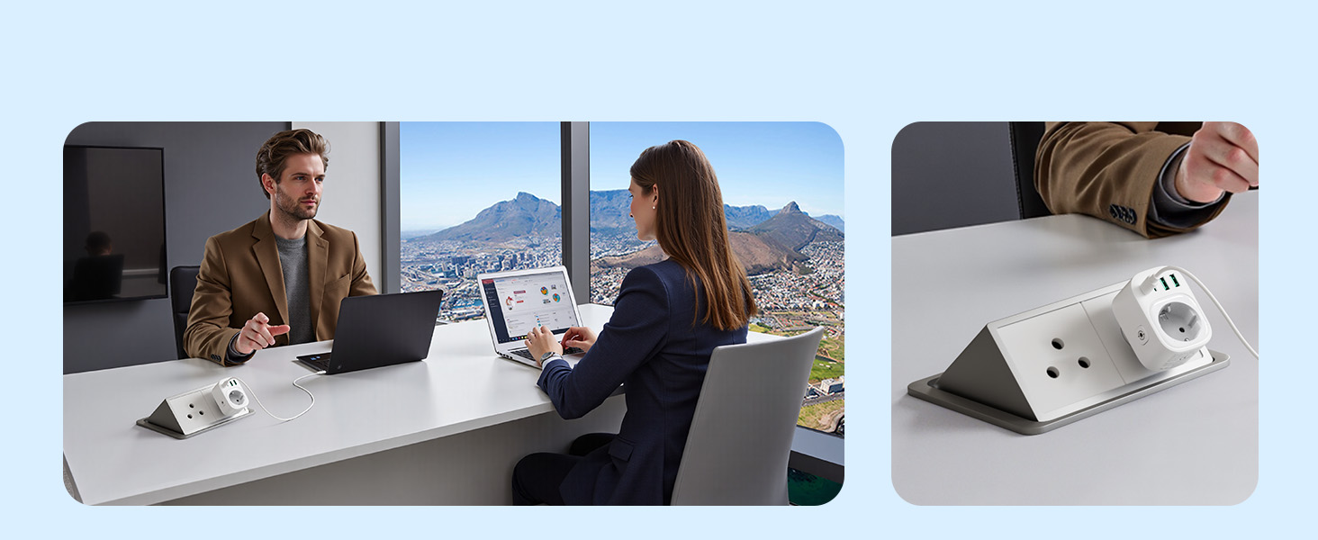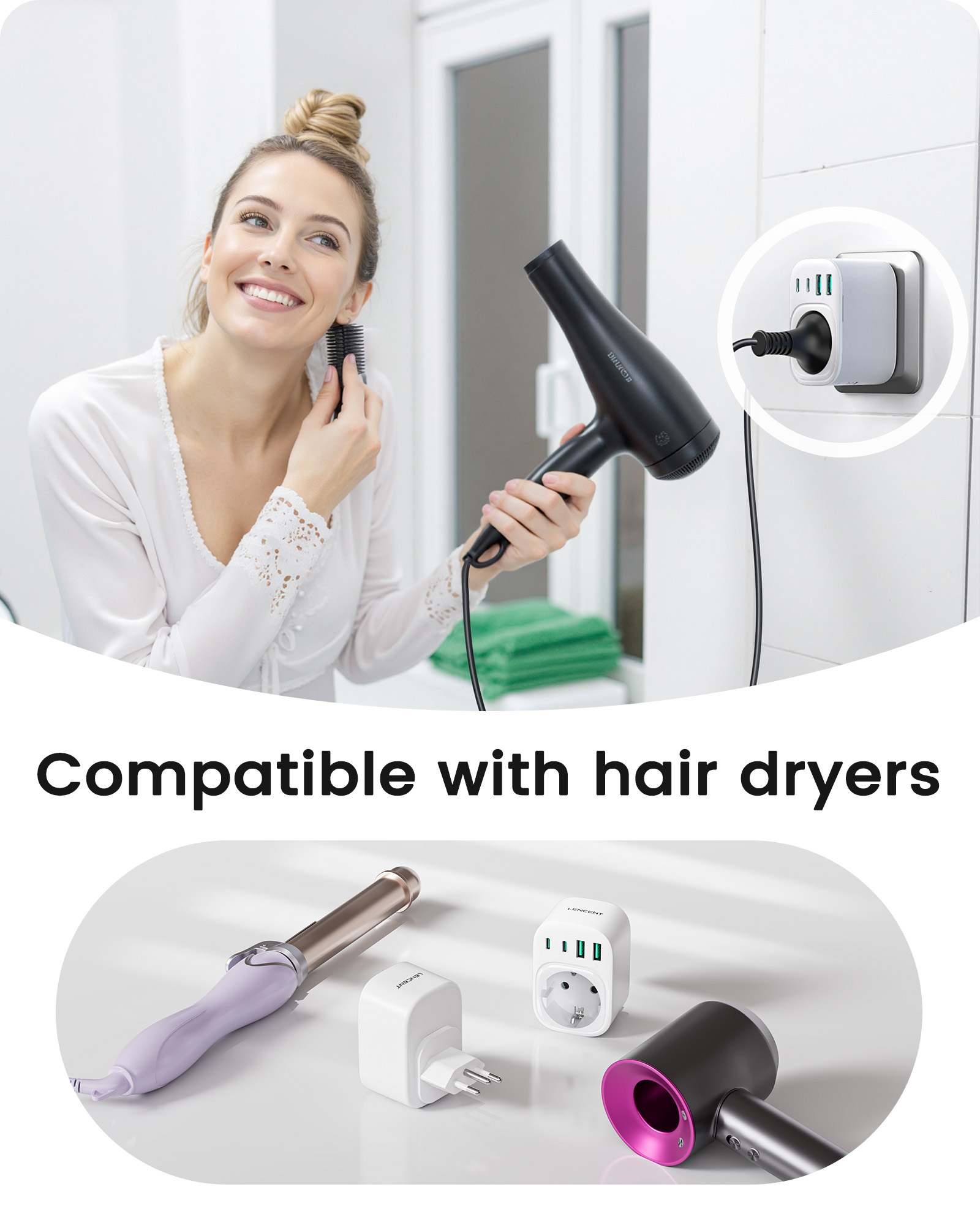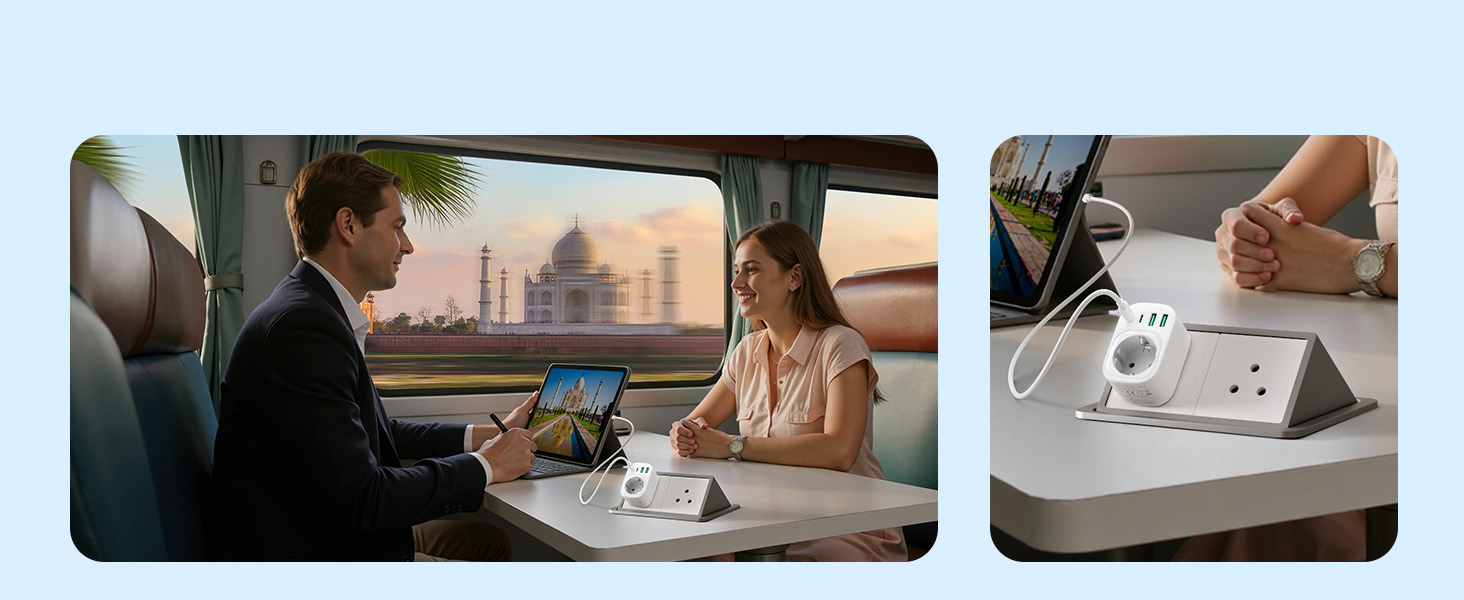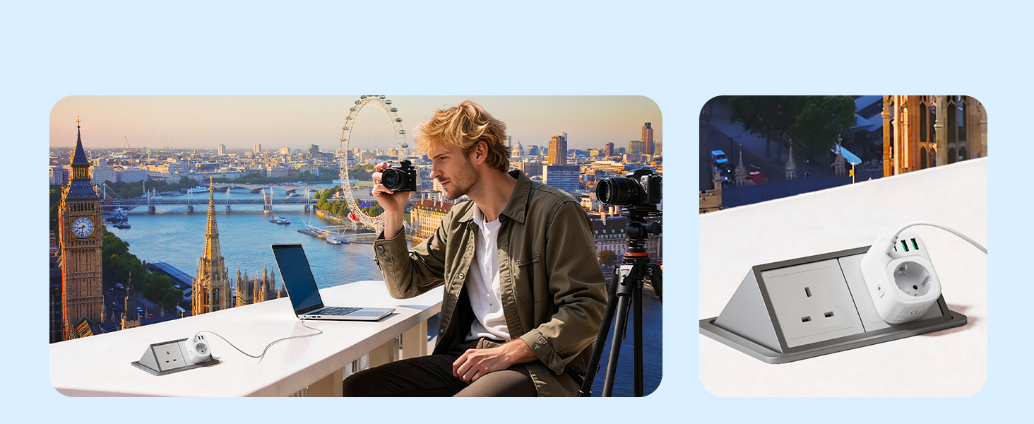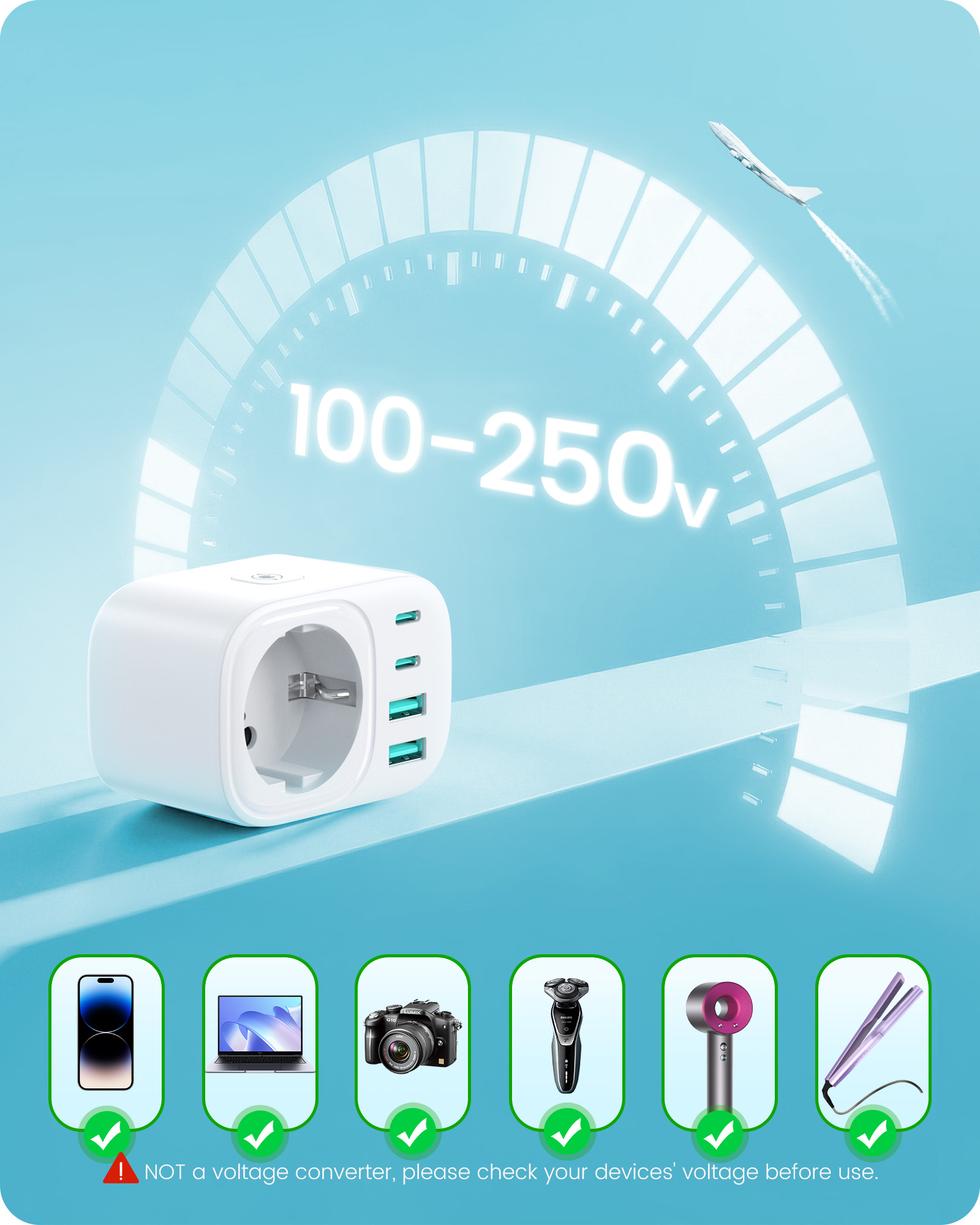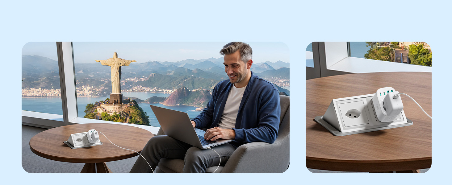 ---[International Travel Adapter] This worldwide travel adapter set includes 4 detachable plug adapters and can be used in over 150 countries. So you no longer have to worry about whether you have the right one. Plug Type D: Mainly used in India, Nepal, Sri Lanka, Pakistan, and other countries. Plug type G: Mainly used in the United Kingdom, Dubai, Malta, Hong Kong, Ireland, Tanzania, Cyprus, Scotland, and other countries. Plug type M: Mainly used in Bhutan, Botswana, India, Israel, Lesotho, Malaysia, Kuwait, Madeira, Mozambique, and other countries. Plug type N: Mainly used in Brazil and South Africa ---[USB Fast Charging] This universal travel adapter features 1 AC outlet, 2 USB-C ports, and 2 USB-A ports. Advanced technology enables charging speeds of up to 3.0 A/15 W on USB-C ports and up to 2.4 A/12 W on USB-A ports, providing power for fast charging of a wide range of USB-powered devices such as smartphones, tablets, laptops, cameras, and more. Ideal for frequent travelers and business travelers. ---[Easy to Use and Carry] An included pouch holds all adapter plugs, keeping them within easy reach at all times. You can switch between the plug types you need anytime, anywhere—it’s incredibly simple to use. Our travel adapter is compact (7.8 x 5.25 x 4 cm) and lightweight (88.3 g), so it takes up very little space in your luggage. Thanks to its compact size, it fits easily into a backpack or briefcase. ---[NOT a voltage converter] It does not convert voltage from 110 V to 220 V or vice versa. Please ensure that your hair dryer, hair straightener, CPAP machine, electric toothbrush, or electric razor is dual-voltage (100 V–240 V) if you wish to use them, as you may otherwise need a voltage converter. ---[Changing the Plug] Installation: ① Align the plug with the port. ② Insert the plug fully until you hear a click. Removal: ③ Hold down the “Switch” button. ④ Pull the plug out of the adapter.