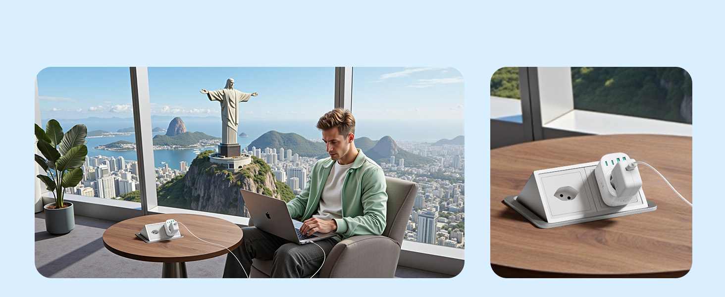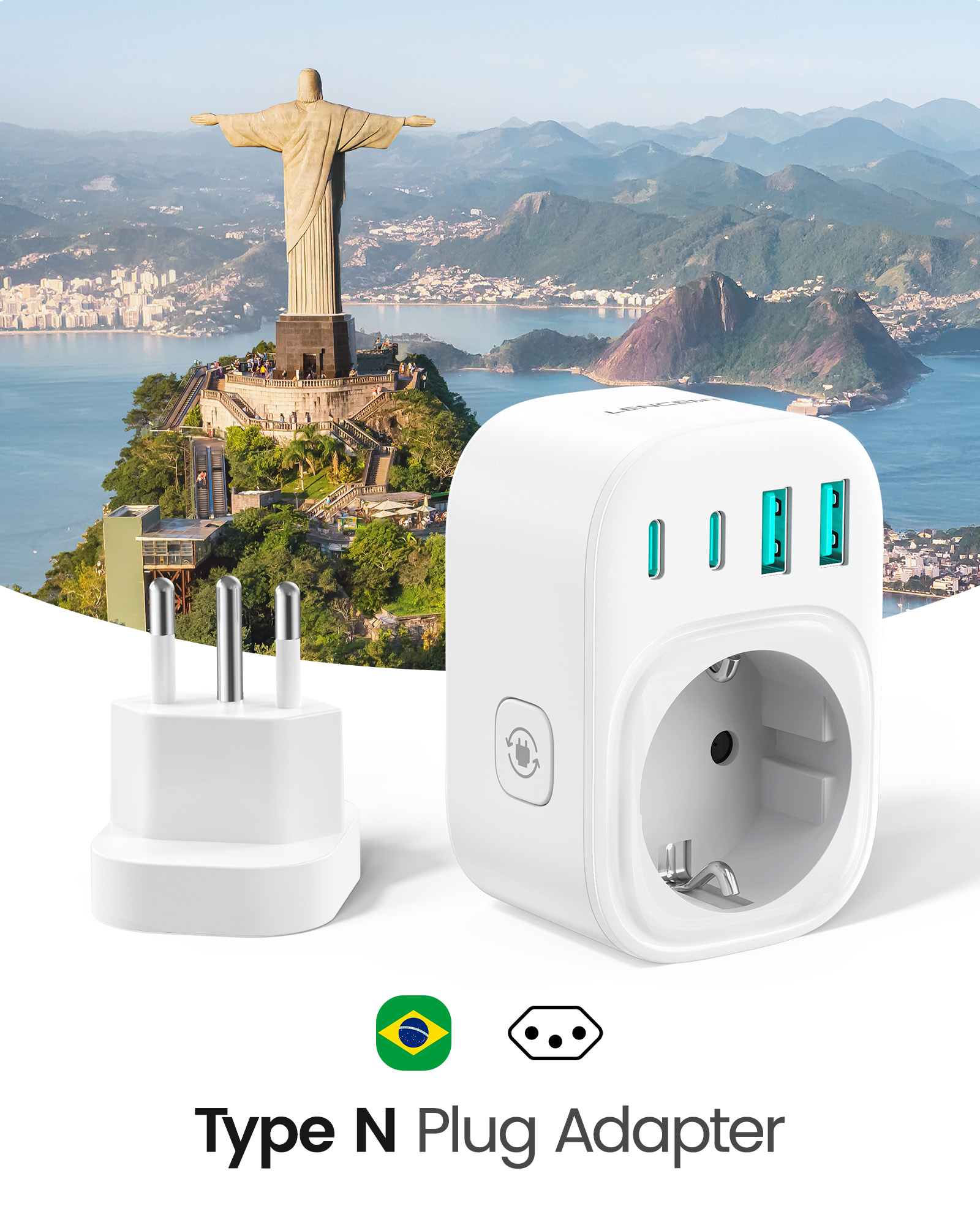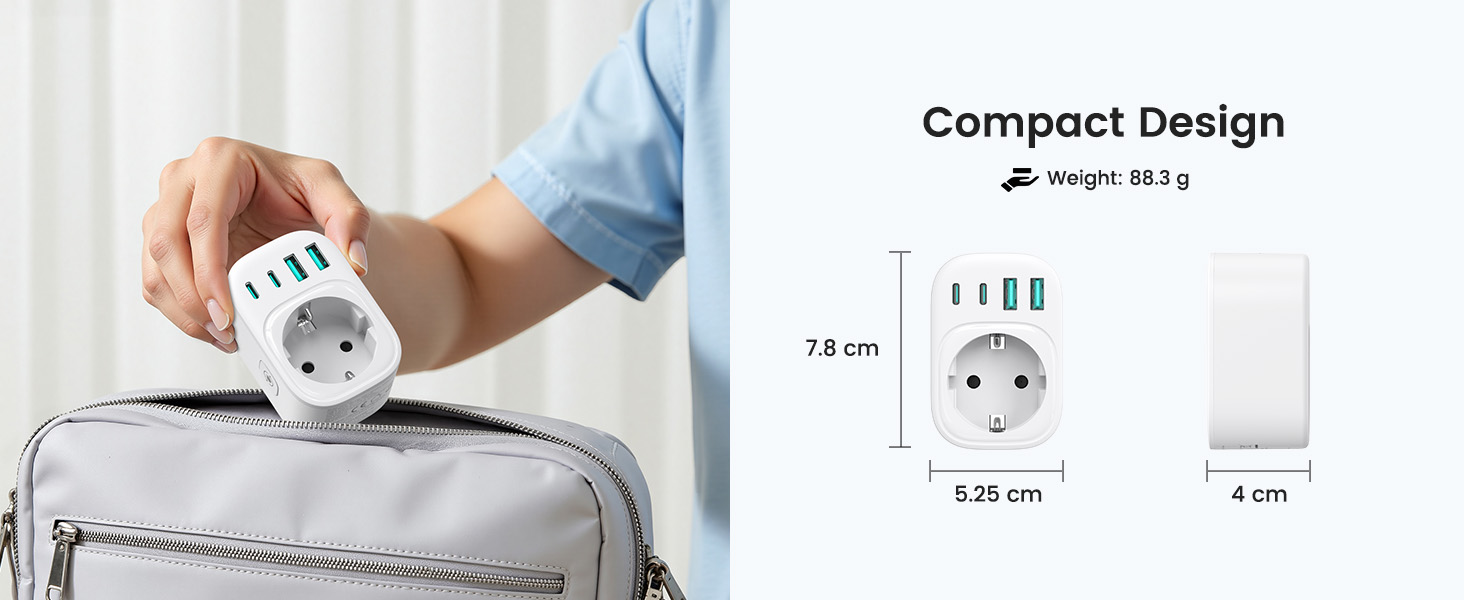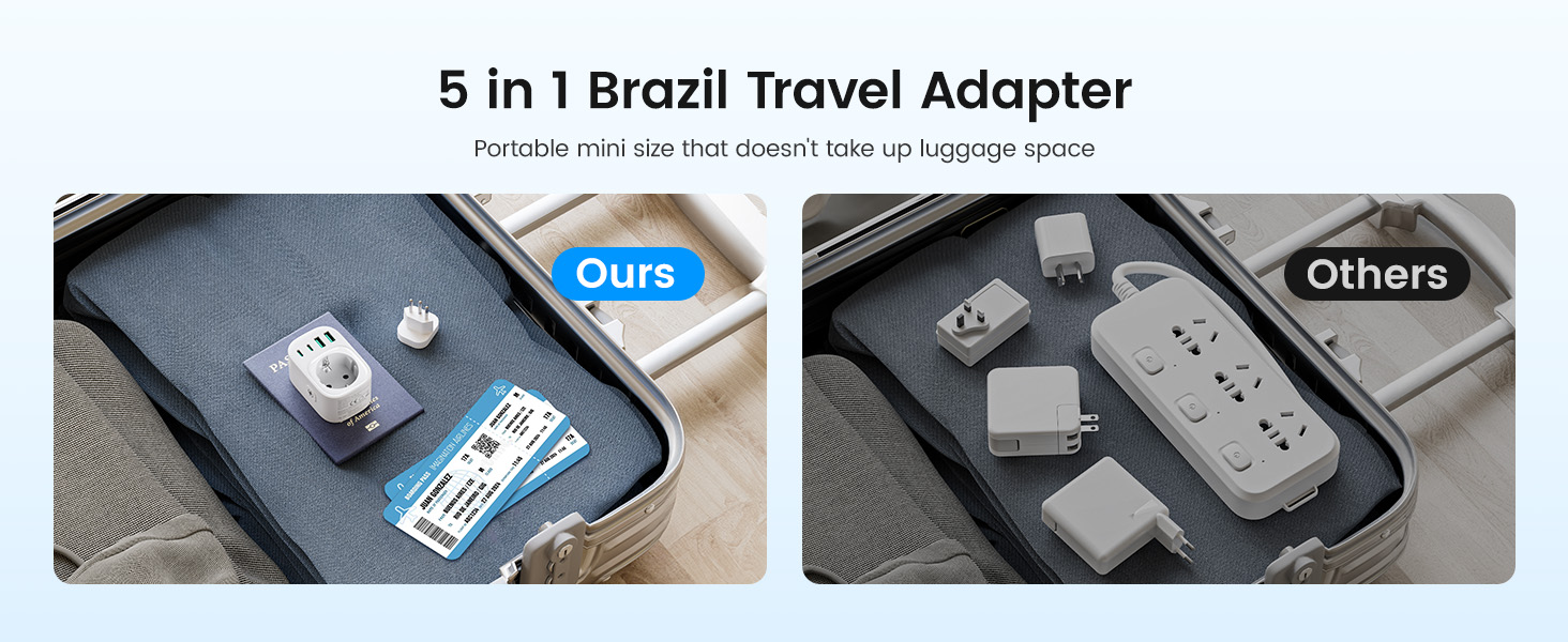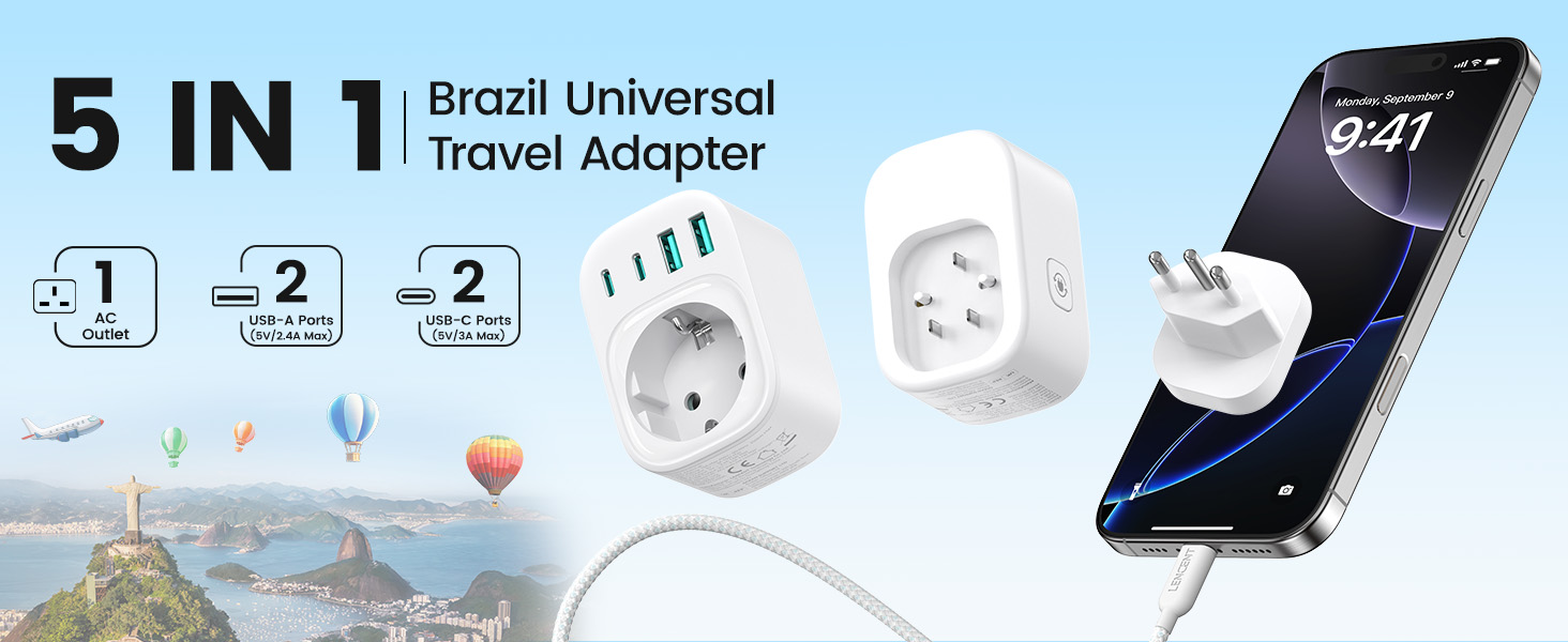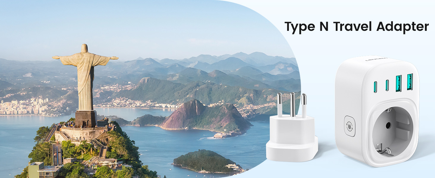 ---[Travel Adapter for Brazil] This 5-in-1 Type N travel adapter is particularly suitable for countries that use Type N plugs, such as Brazil and South Africa. ---[5-in-1 Brazil Travel Adapter] This Type N travel adapter features 1 AC outlet, 2 USB-C ports, and 2 USB-A ports. It allows you to charge 6 devices simultaneously without any issues. You don’t need to pack a power strip or additional adapters for your trip. Just take it with you and go! ---[USB Fast Charging] Advanced technology enables charging speeds of up to 3.0 A/15 W on USB-C ports and up to 2.4 A/12 W on USB-A ports, providing power for fast charging of a wide range of USB-powered devices such as smartphones, tablets, laptops, cameras, and more. Ideal for frequent travelers and business travelers. ---[Easy to Use and Carry] Our travel adapter is compact (7.8 x 5.25 x 4 cm) and lightweight (88.3 g), so it takes up very little space in your luggage. Thanks to its compact size, it fits easily into a backpack or briefcase. ---[NOT a Voltage Converter] It does not convert voltage from 110 V to 220 V or vice versa. Please ensure that your hair dryer, hair straightener, CPAP machine, electric toothbrush, or razor has a dual voltage rating of 100 V–240 V if you wish to use them, as you may otherwise need a voltage converter.