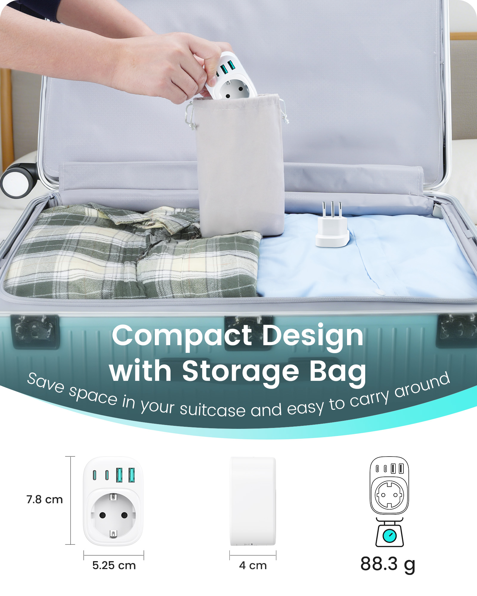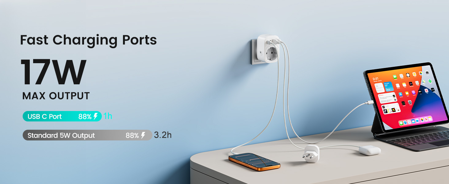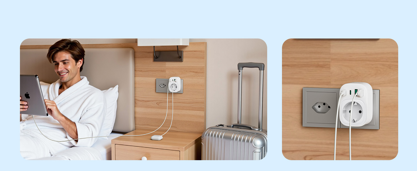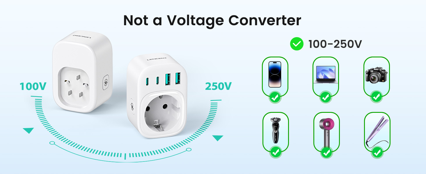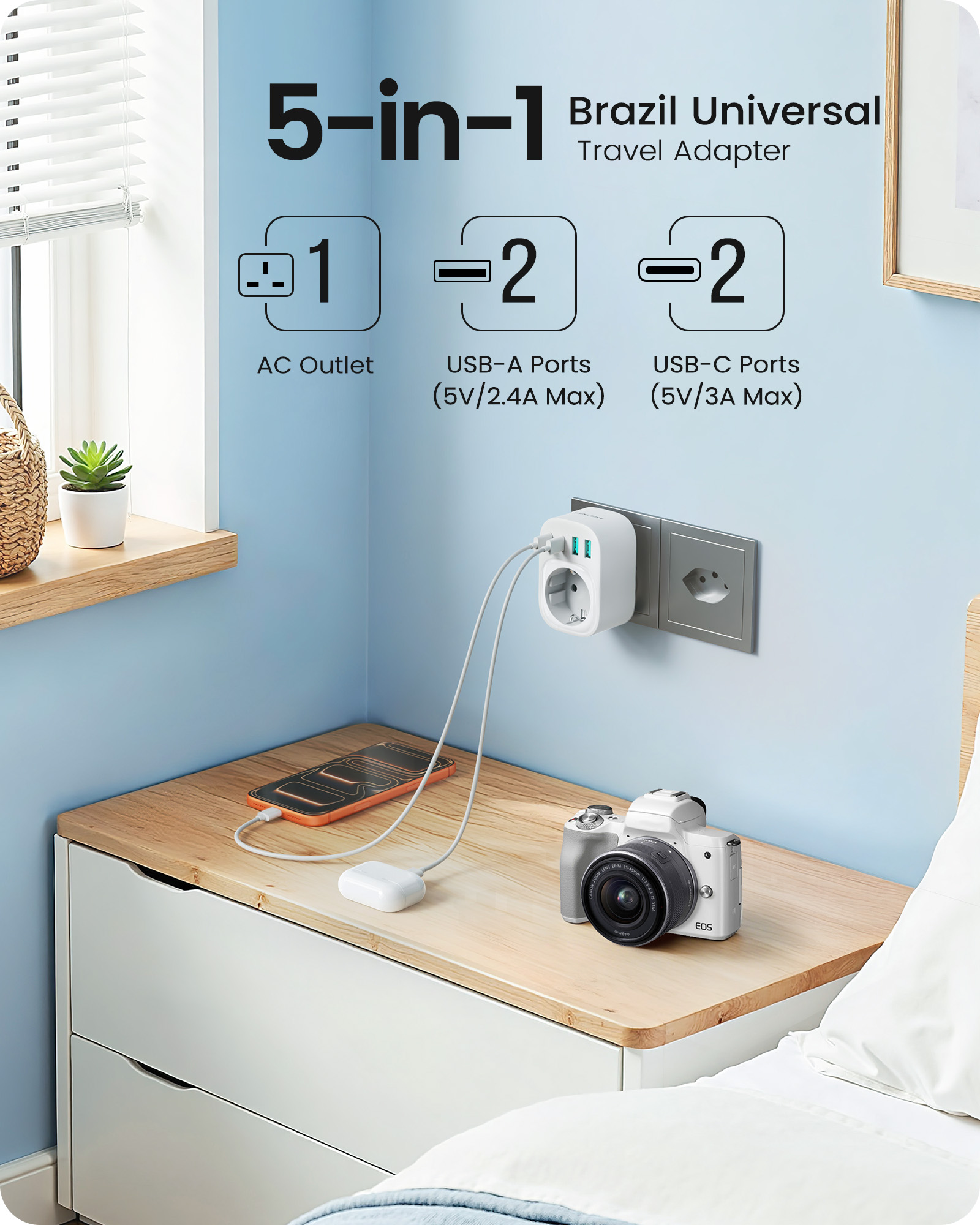 ---[Travel Adapter for Brazil] This 5-in-1 Type N travel adapter is particularly suitable for countries that use Type N plugs, such as Brazil and South Africa. ---[5-in-1 Brazil Travel Adapter] This Type N travel adapter features 1 AC outlet, 2 USB-C ports, and 2 USB-A ports. It allows you to charge 6 devices simultaneously without any issues. You don’t need to pack a power strip or additional adapters for your trip. Just take it with you and go! ---[USB Fast Charging] Advanced technology enables charging speeds of up to 3.0 A/15 W on USB-C ports and up to 2.4 A/12 W on USB-A ports, providing power for fast charging of a wide range of USB-powered devices such as smartphones, tablets, laptops, cameras, and more. Ideal for frequent travelers and business travelers. ---[Easy to Use and Carry] Our travel adapter is compact (7.8 x 5.25 x 4 cm) and lightweight (88.3 g), so it takes up very little space in your luggage. Thanks to its compact size, it fits easily into a backpack or briefcase. ---[NOT a Voltage Converter] It does not convert voltage from 110 V to 220 V or vice versa. Please ensure that your hair dryer, hair straightener, CPAP machine, electric toothbrush, or razor has a dual voltage rating of 100 V–240 V if you wish to use them, as you may otherwise need a voltage converter.