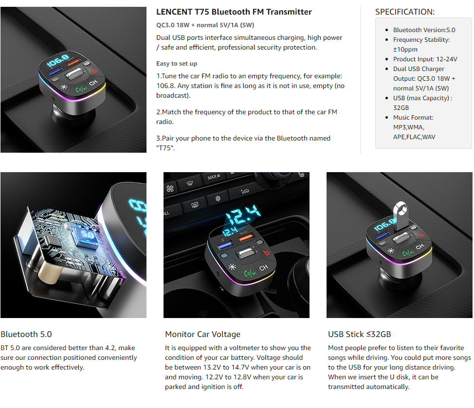 [ Double Loud Microphone for Handsfree Calls] The dual microphone car FM transmitter is equipped with the latest CVC8.0 noise cancellation and Digital Signal Processor (DSP) technologies, working in tandem to pick up your voice from all directions. Thus giving you and your caller a higher level of calling experience. [ 9-Color LED Design & Light Off] The car FM transmitter is designed with 9-color LED lights: red, blue, green, yellow, purple, cyan, white, rainbow, rainbow stream and light off. You will see the pulsing light in the dark and adjust the desired color. Facilitates operation and safer driving while driving at night, or you can turn it off. [ QC3.0 Fast Charger & Dual USB Ports] The car charger with two USB ports, can charge 2 devices at the same time and provide high-speed charging to driver and passenger. QC3.0 fast charging port is 5V/3A, up to max 18W. Another USB port is 5V/1A, can charge devices as well as can read music files in the usb stick, such as MP3, WMA, WAV format. [ Immersive Hi-Fi Audio & AUX Mode] You can enjoy the fantastic deep bass music by pressing B button. Hi-Fi sound quality will also make the music more dynamic and pleasant to your ear. In addition, you can listen to music by 3 ways by connecting Bluetooth devices/ AUX cable/ USB stick (≤32GB). So you can connect the FM transmitter to your car via the included AUX cable and enjoy the CD-like sound quality. [ Activate Siri & Google Assistant] LENCENT car Bluetooth FM transmitter can receive clear voice commands to ensure safe driving. You can stay fully focused on the road by engaging Siri or Google Assistant to make phone calls, send messages or get directions. This option allows you to enjoy safer driving.