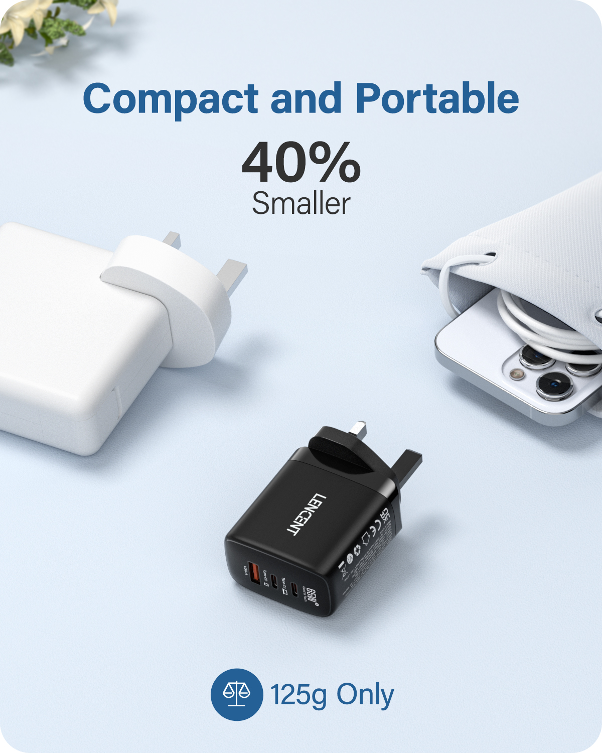 【65W PD Fast Charging】With smart charging technology, our fast charger can fully charge your laptop within 2 hours. Both USB-C1 port and USB-C2 port can provide 65w high speed charging when you connect a single device. Allow you to charger 3 devices at the same time. 【Advanced GaN III Technology】 The LENCENT wall charger is capable of intelligently identifying connected devices and detecting and delivering optimum charging current, ensuring fast and safe charging. Besides, it protects your devices from over-voltage, overheating, over-current and short circuit. 【Strong compatibility】 The 65W PD fast charger is compatible with almost all USB devices like iPhone 14/14 Pro/14 Pro Max/14 Plus/iPhone 13/13 Pro/13 Pro Max, iPad Pro/iPad Air, MacBook Pro/Macbook Air, Samsung Galaxy S22 Ultra/S21 Ultra Series and so on. Compact and Portable】 Our type-c charger is more smaller and lightweight(114g only), can meet your storage needs. It is very convenient for you to carry out or used at home. 【24 Hours Safety Protection】This GaN3 charger certified by CE FCC can improve durability and safety, can effectively protect your devices, you, and your family.
